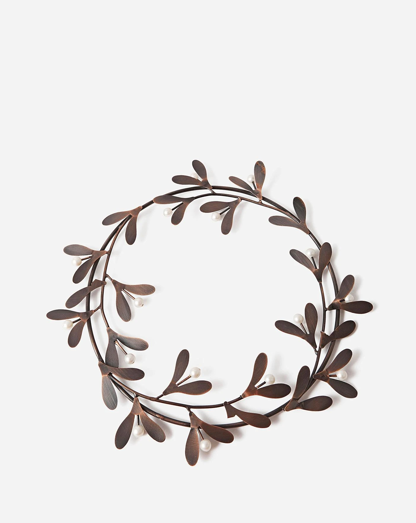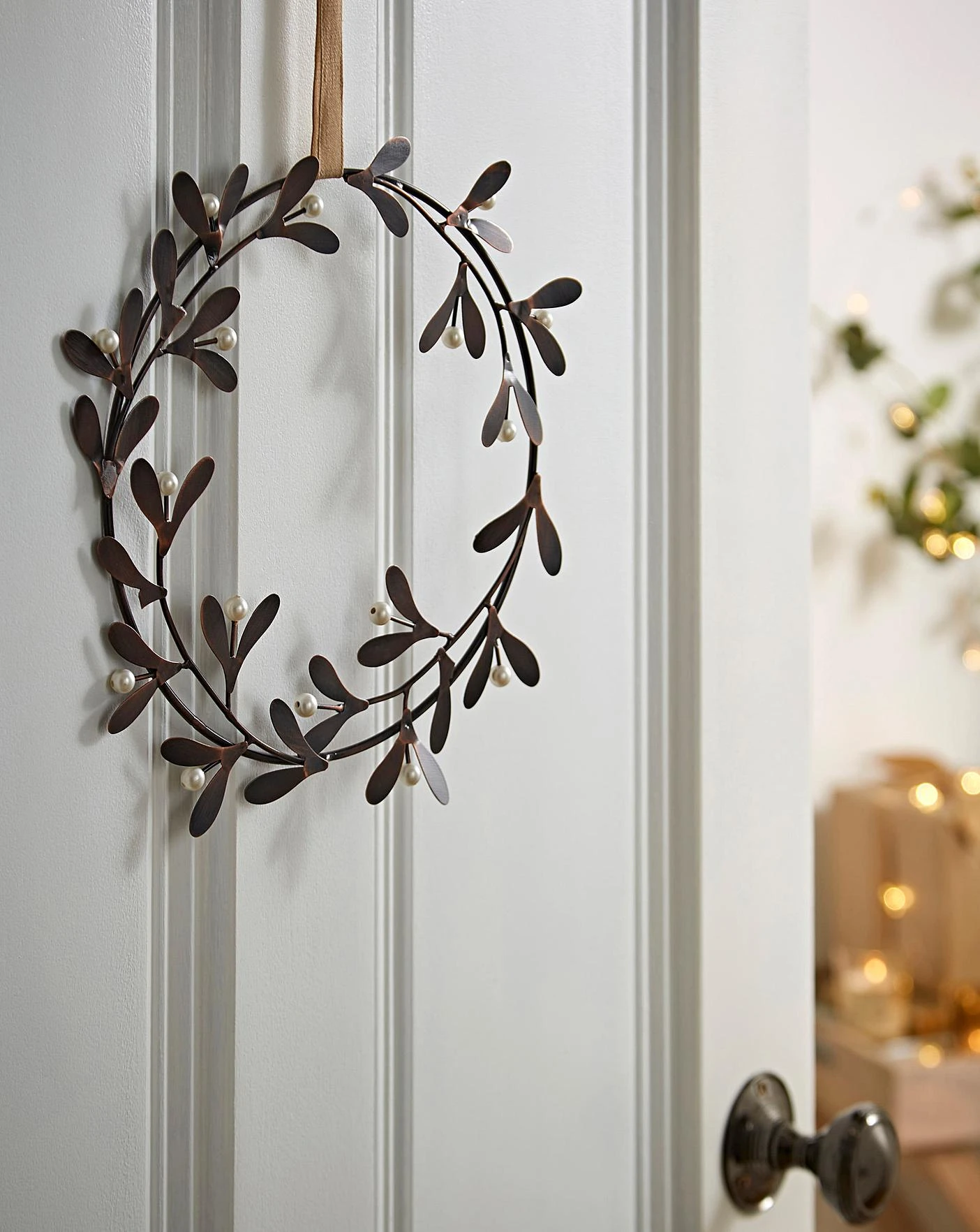 Ivyline antique gold mistletoe wreath made from metal and Glass with a hand painted detail. Indoor use only. Wipe clean with a damp cloth.