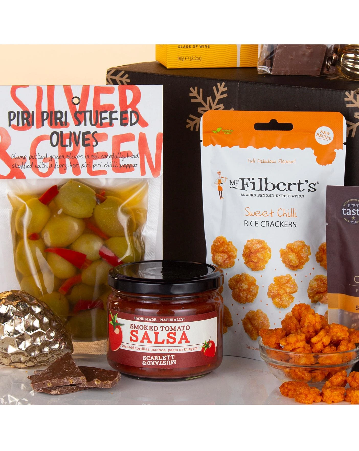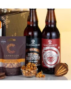 Contents: Blanco Nino Smoky Chipotle 170g, Cambrook Brilliantly Caramelised Sesame Peanuts 45g, Dean’s Extra Mature Cheddar Cheese Bites 90g, Guppy’s Milk Chocolate Honeycomb Shards 90g, Mr Filbert’s Sweet Chilli Rice Crackers 40g, Scarlett & Mustard Smoked Tomato Salsa 300g, Silver & Green Piri Piri Stuffed Olives 220g, Glastonbury Brewing Co Festivale Ale Infused With Cranberries 500ml 4.6% vol, Glastonbury Brewing Co Hedge Monkey Bitter 500ml 4.6% vol, Decorative Postal Outer.