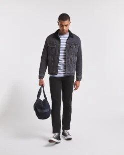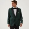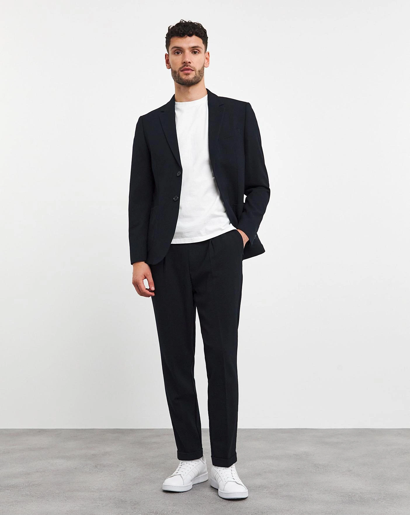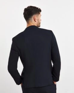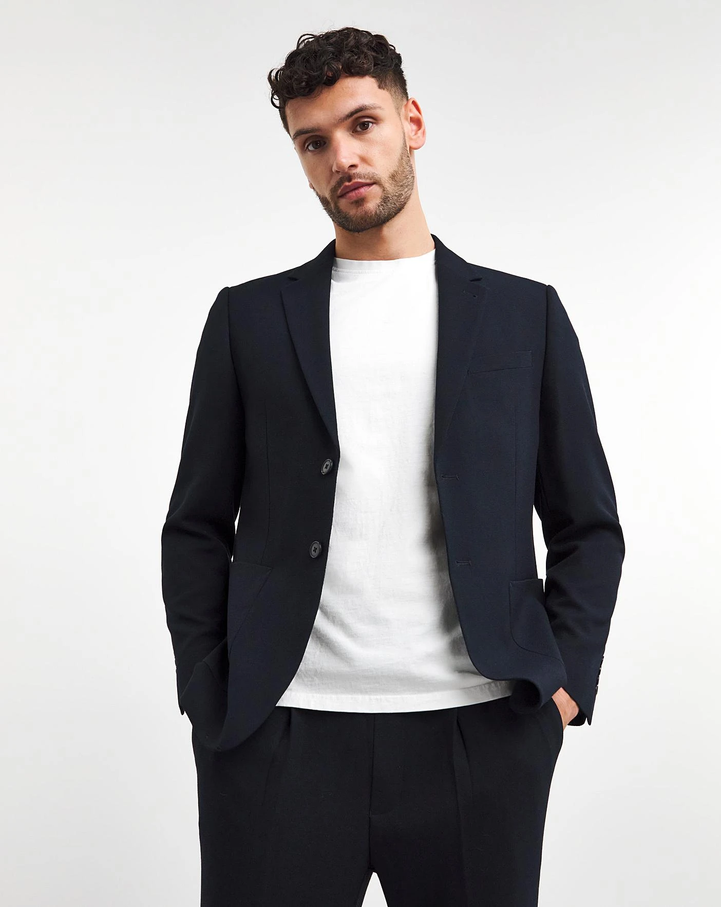 Jersey formalwear blazer in Navy. Long sleeved with button detailing. Model is 6’1 and wears size 40R
