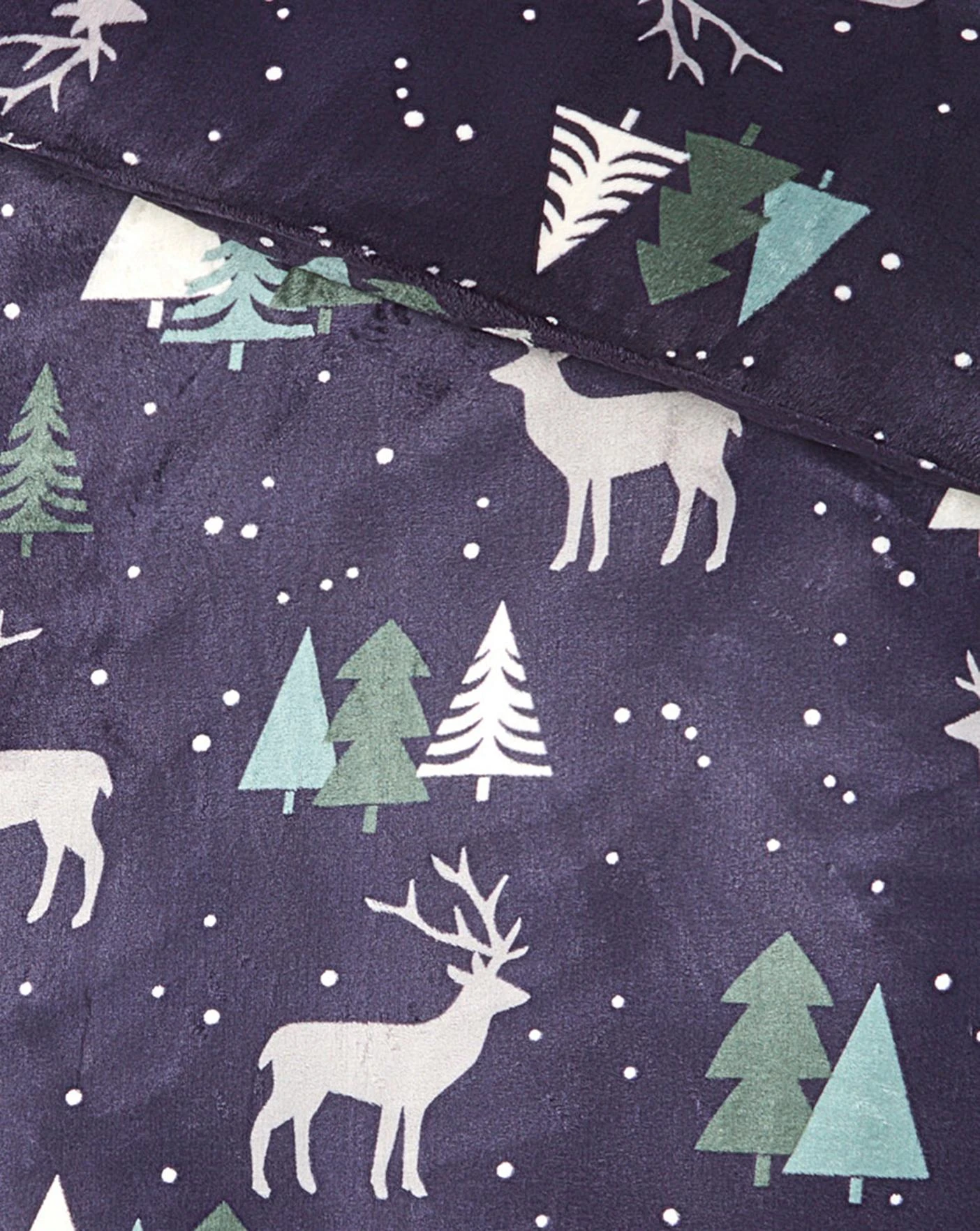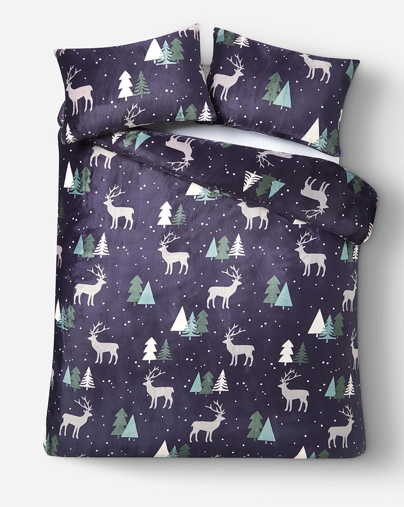 The New Stag Fleece bedding set features a festive stag pattern repeat print with a contrast reverse. The set includes 2x pillowcases (1x single) and 1x duvet cover.