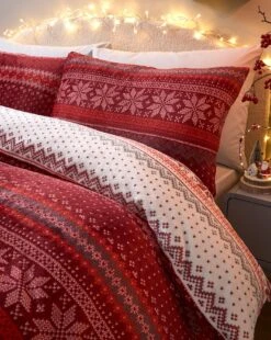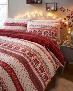 The Fairisle Fleece bedding set features a repeat fairisle print with a contrast reverse. The set includes 2x pillowcases (1x single), 1x duvet cover.