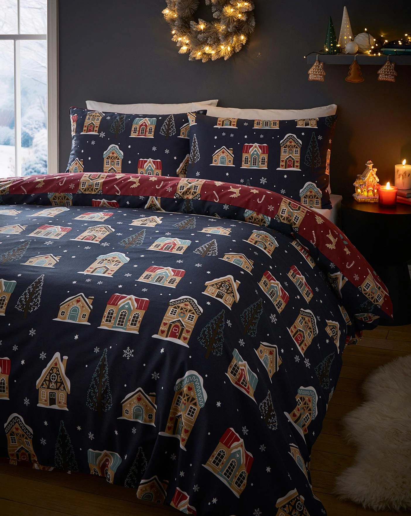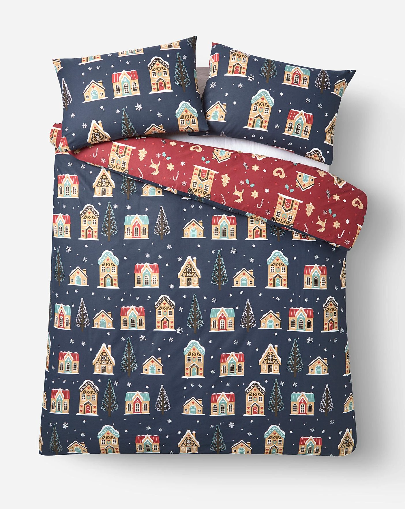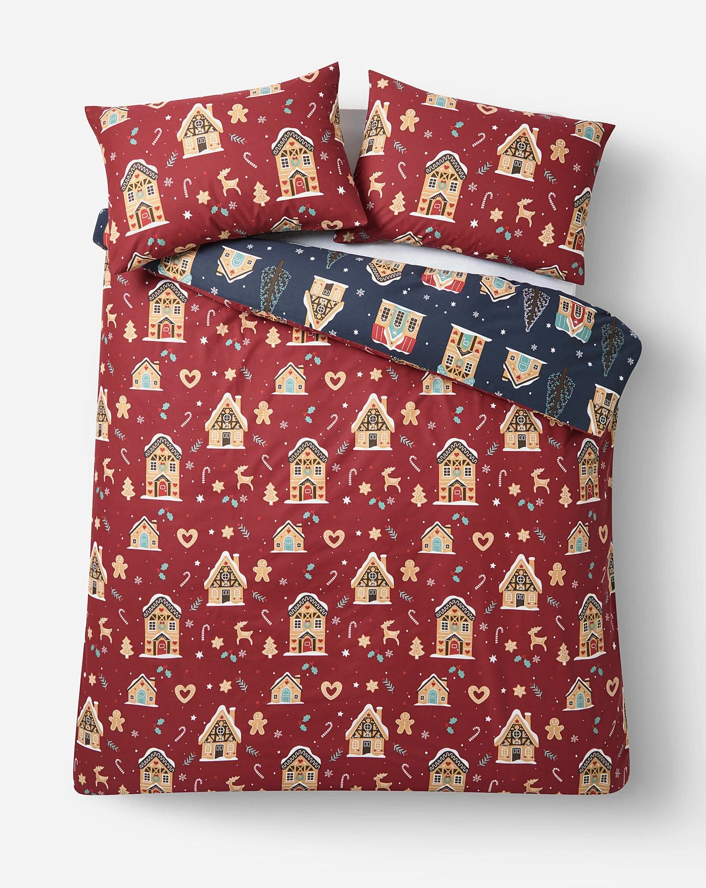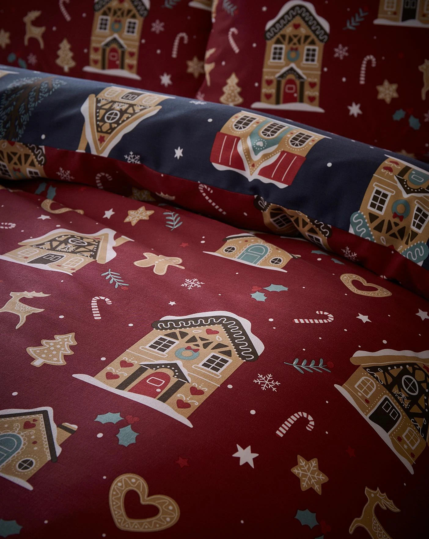 The Christmas Stocking microfibre bedding set features a festive christmas stocking repeated pattern print with a contrasted patterned reverse. The set includes 2x pillowcases (1x single), and 1x duvet cover.