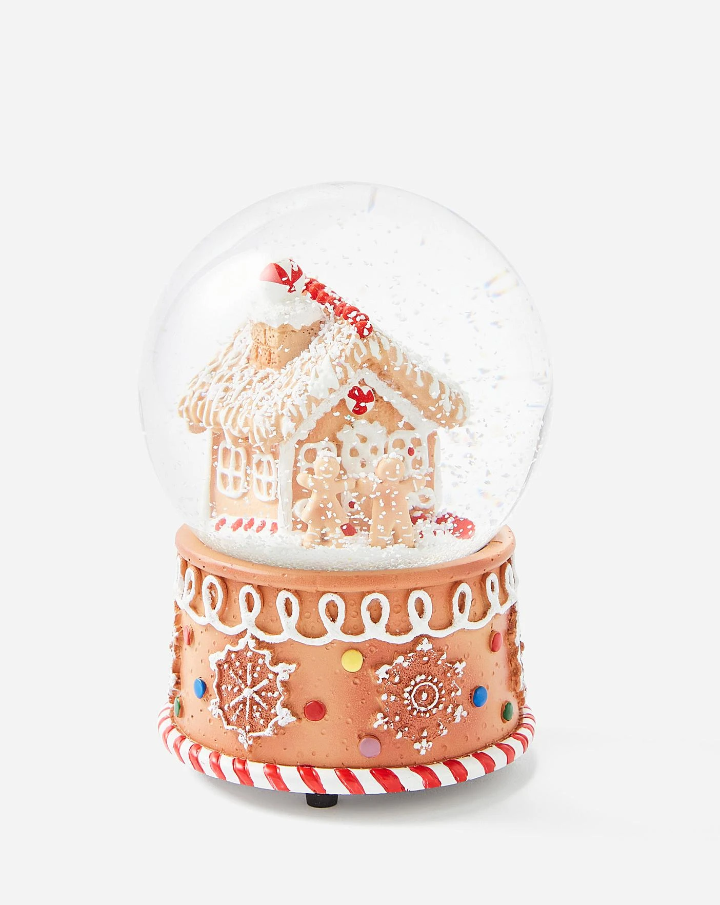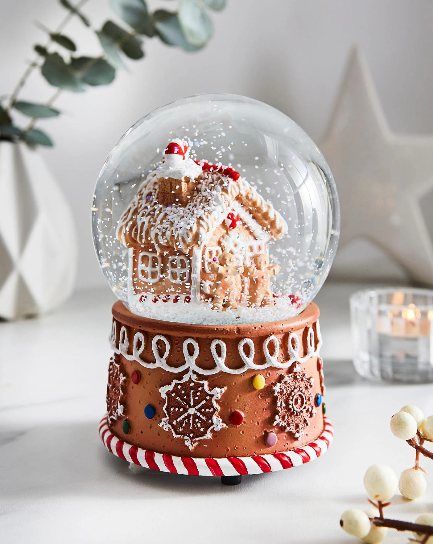 Gisela Graham gingerbread house Musical snow dome plays the tune We wish you a merry Christmas and is made from resin, glass and water. This is not a toy and is for decoration purposes only. Indoor use. Wipe clean with a soft dry cloth.