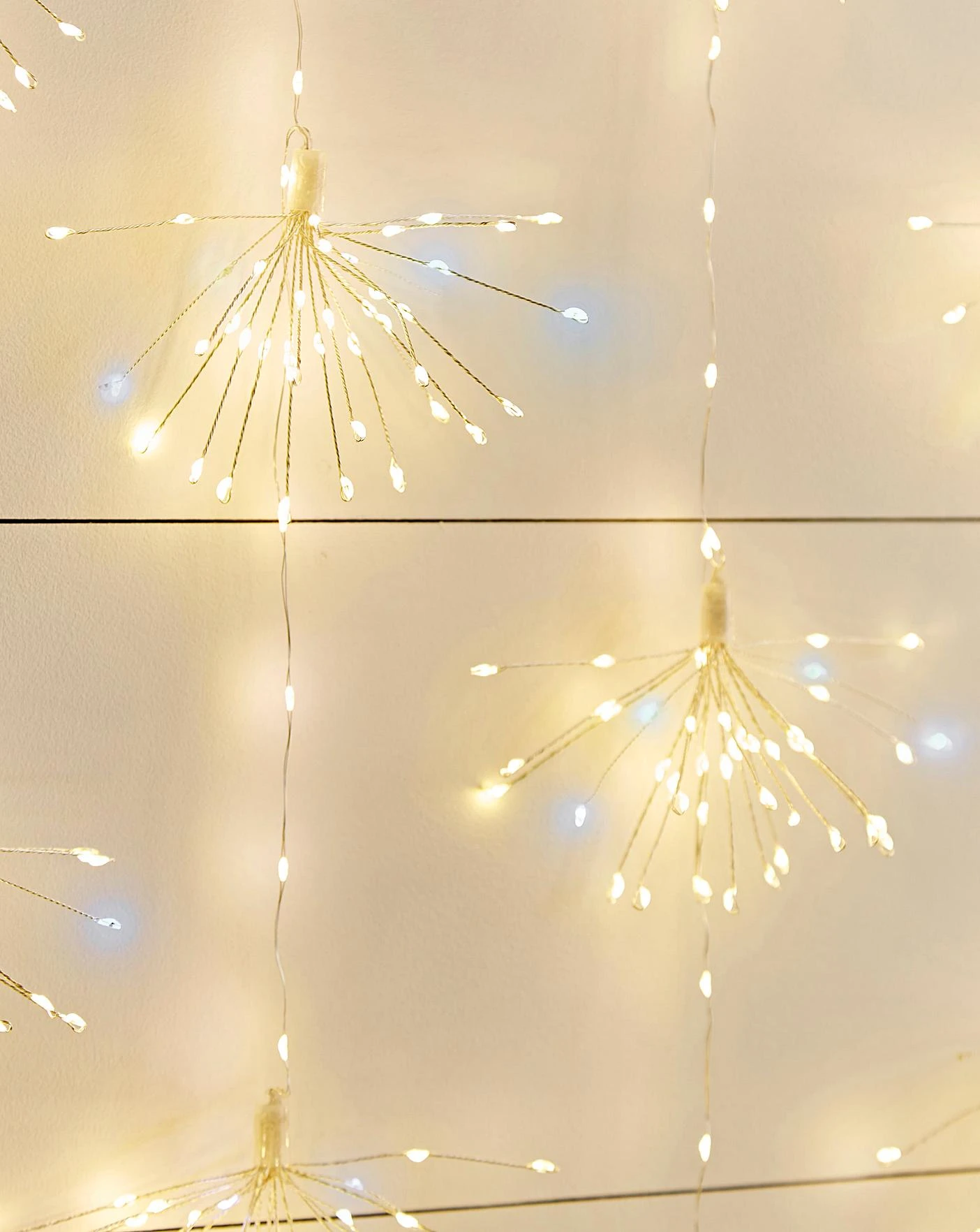 Fantastic curtain light with total 598 LEDs lighting the starburst designs, some of which flash creating a twinkling effect. With alternate length drops and total width 120cm. Each starburst is 15cm diameter.