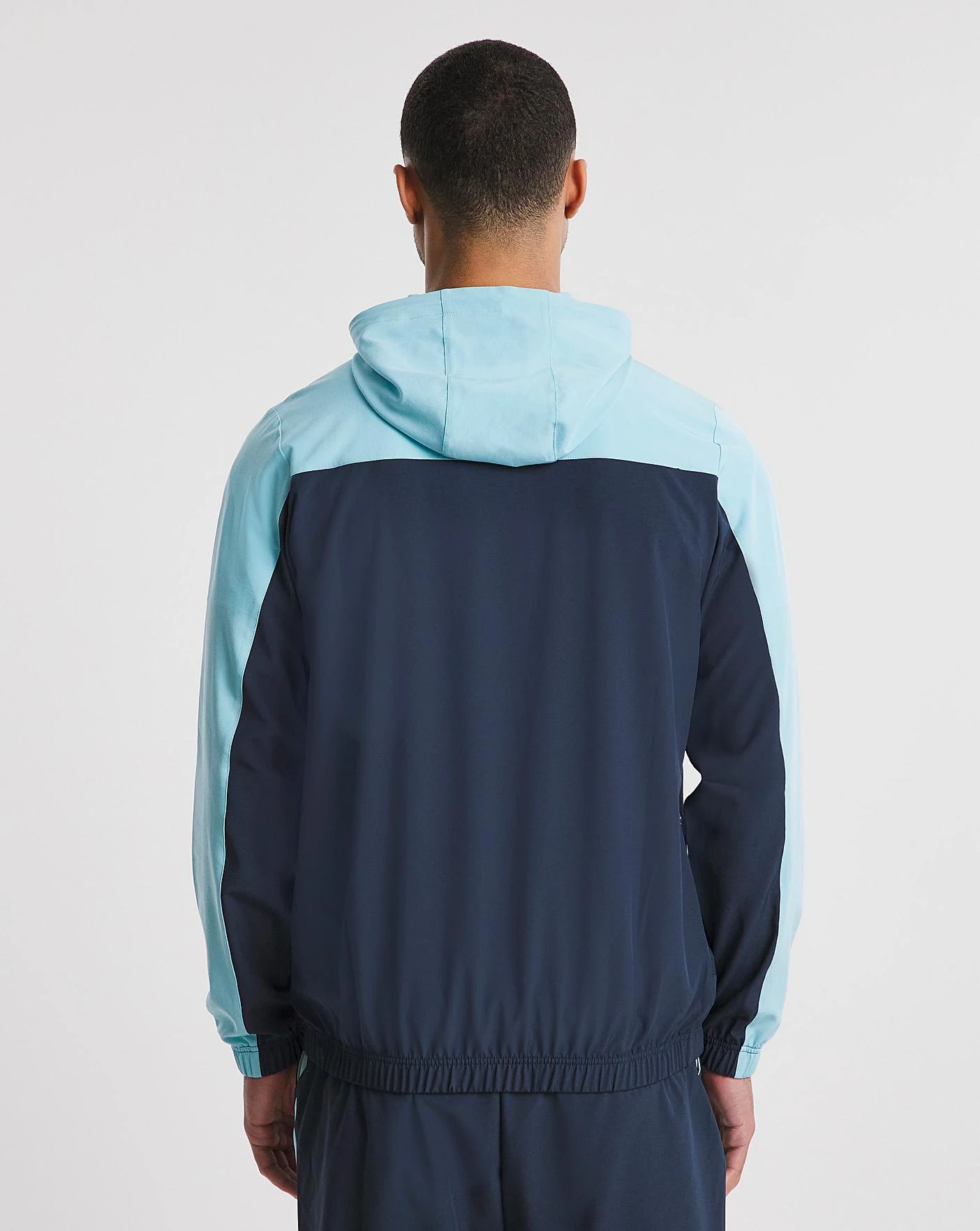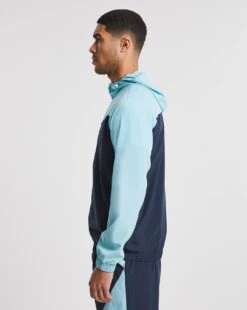 This blue and navy windbreaker from Jacamo Active can be worn layered over a sweatshirt or long sleeve top to cut through wind chill. This zip up top is light weight and contains stretch properties within its fabrication for extra comfort while you are on the move. It also features a hood with toggles so it can be pulled tight around your face and a front zip chest pocket .