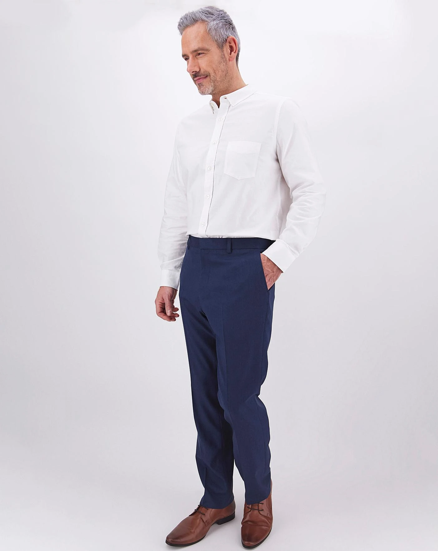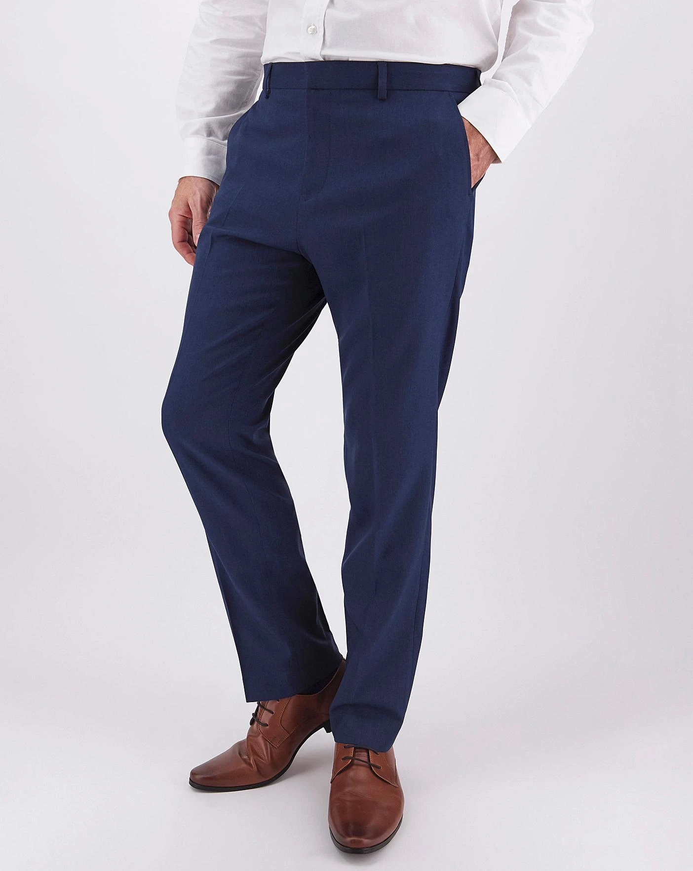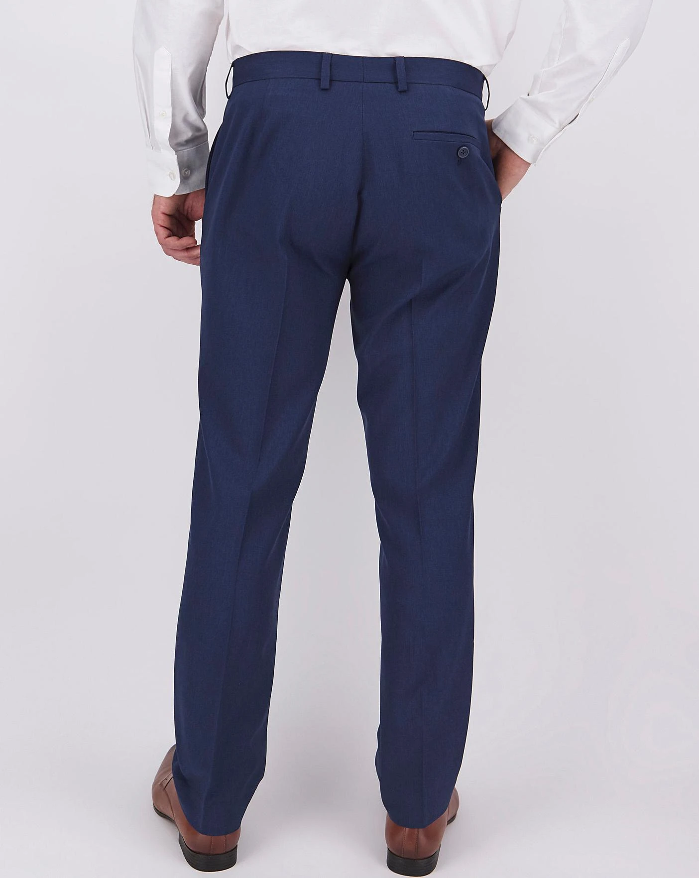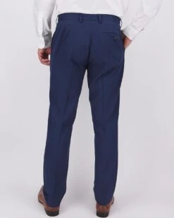 Suit trousers with a zip fly, hook-and-bar fasten with button, two side pockets, belt loops and one rear pocket with button fasten.