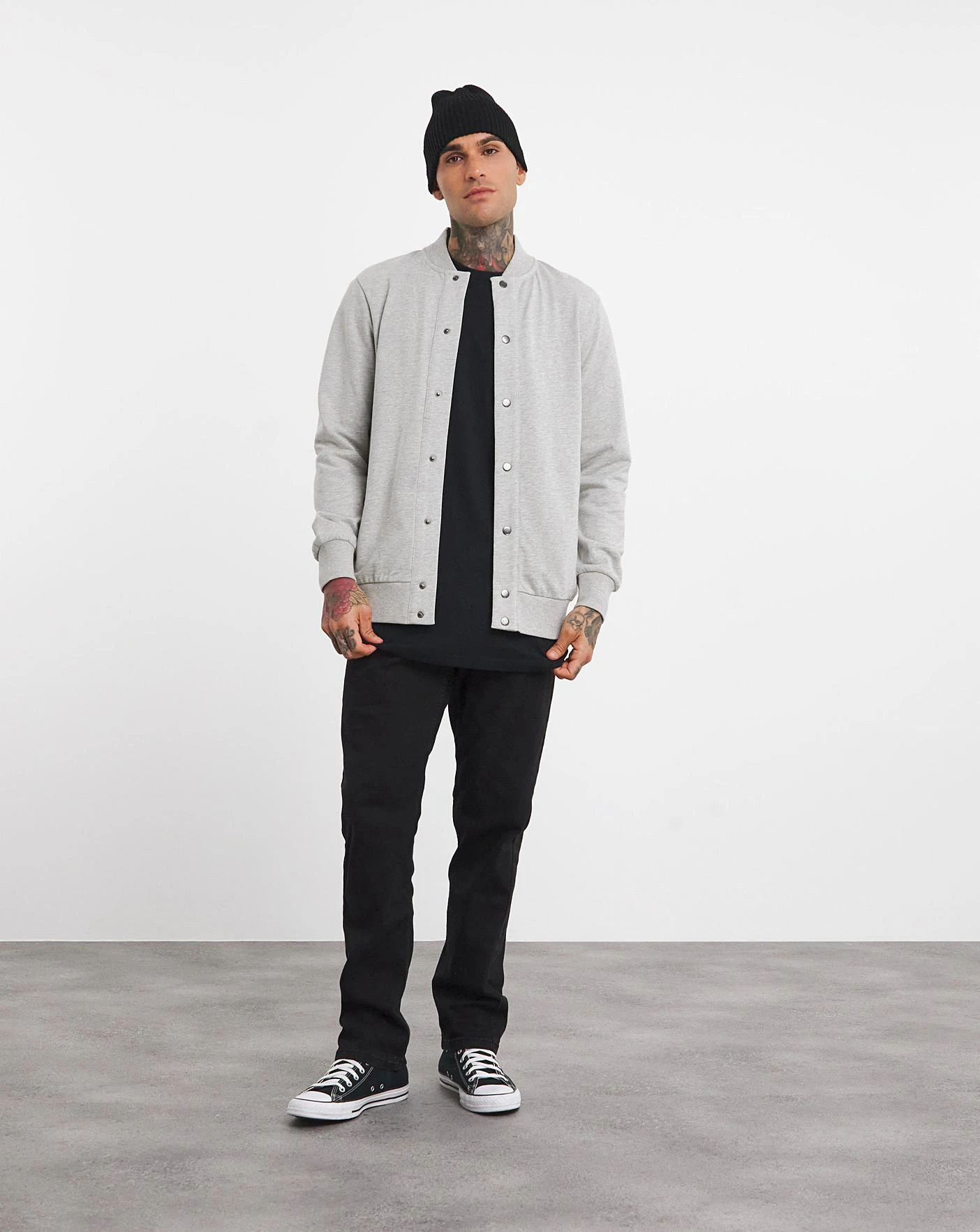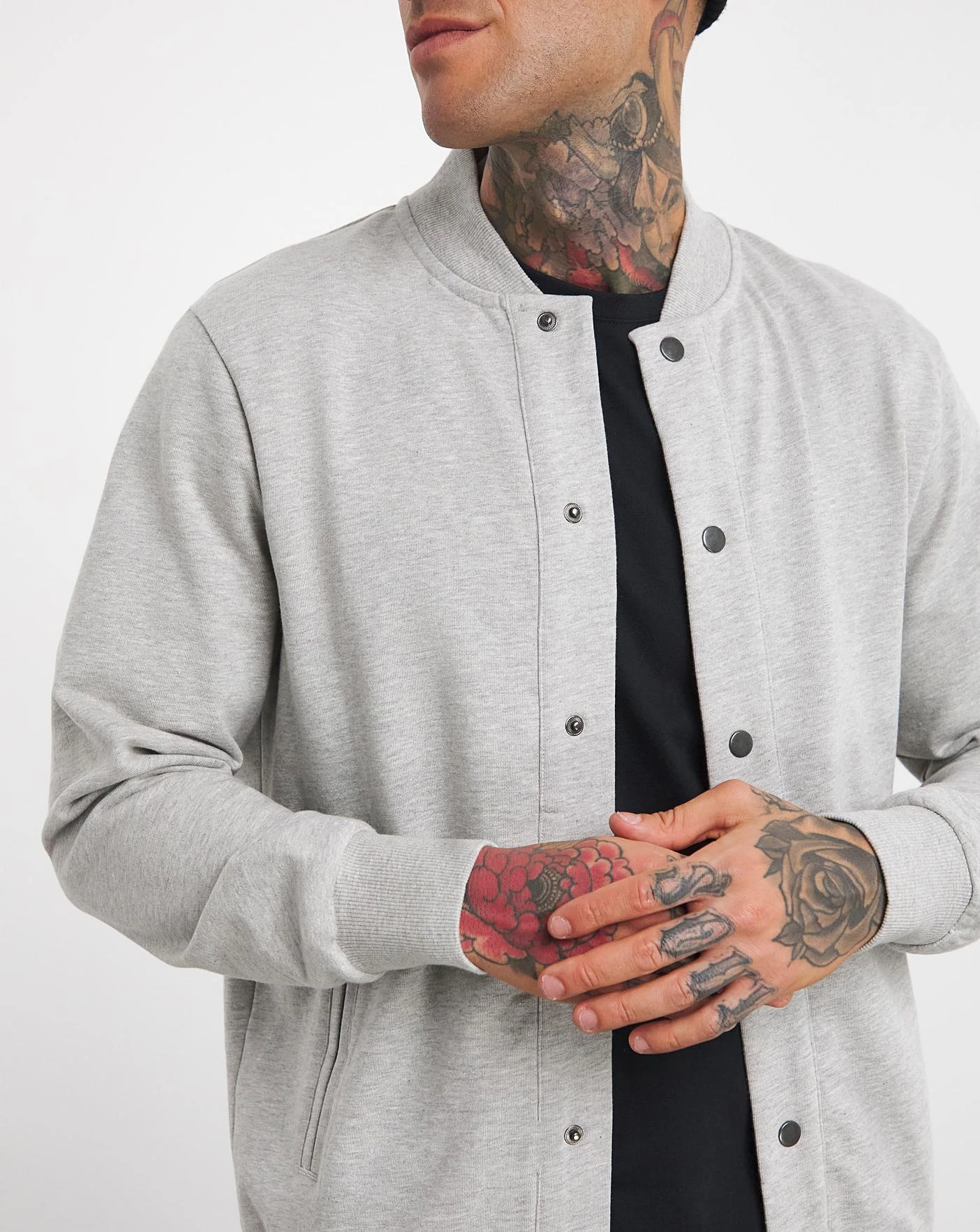 This Jersey Bomber Jacket comes in Grey Marl and is a staple for your autumn wardrobe. Model is 6’1 and wears a size M.