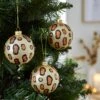 Set of 3 Joanna Hope gold star design baubles with gold caps and hanging ribbon and will arrive in a white presentation gift box. These baubles are made from glass and for indoor use only. Wipe clean with a soft dry cloth.