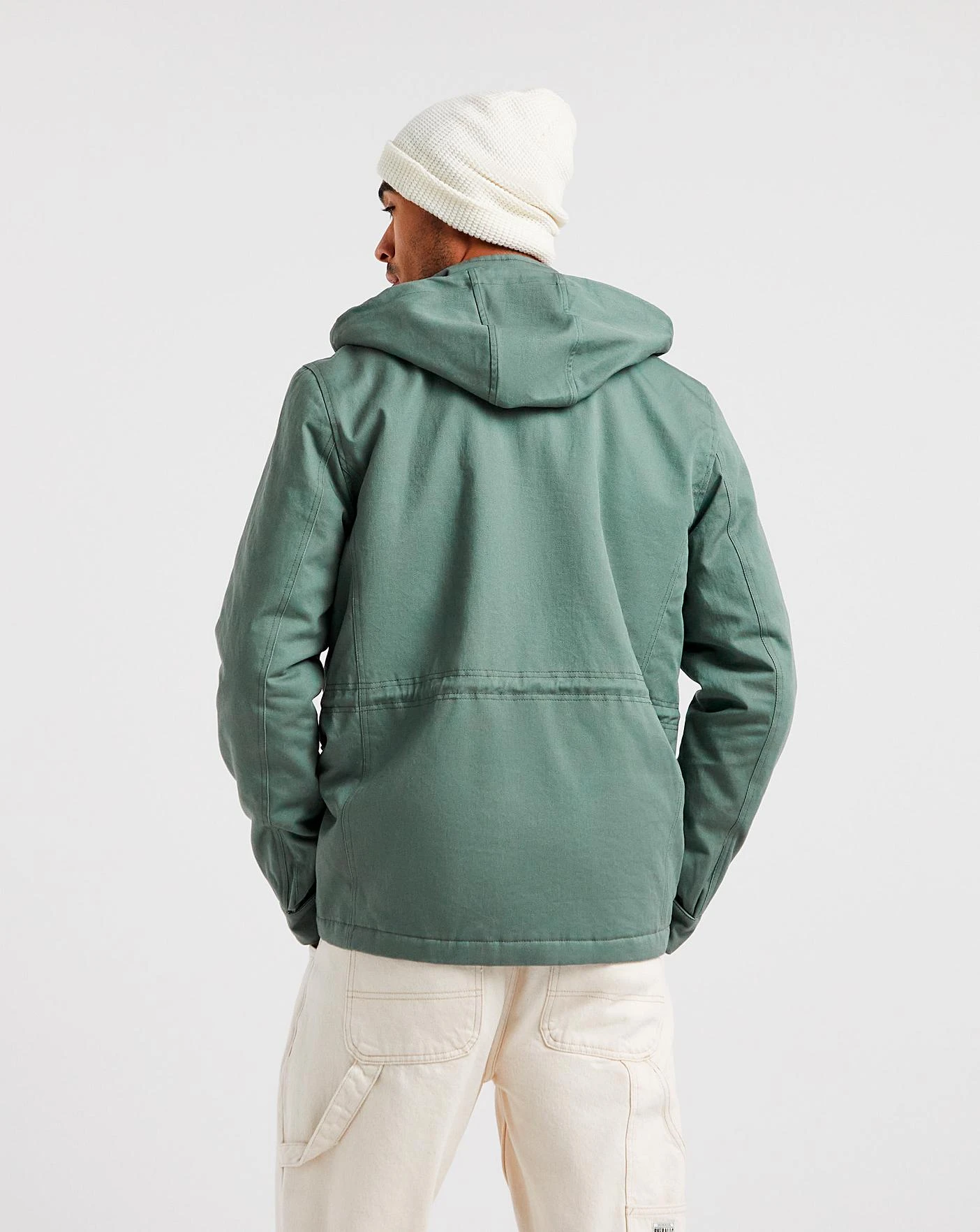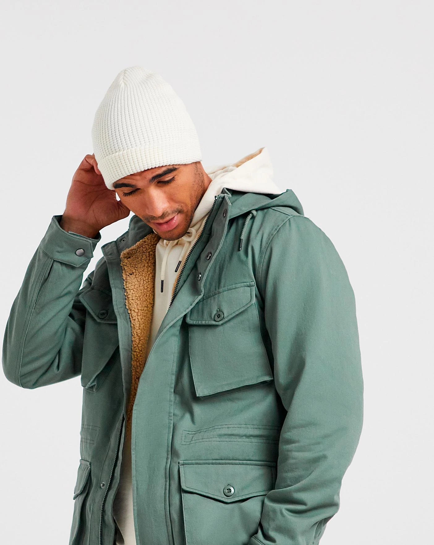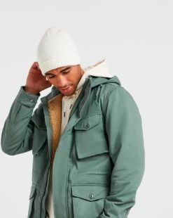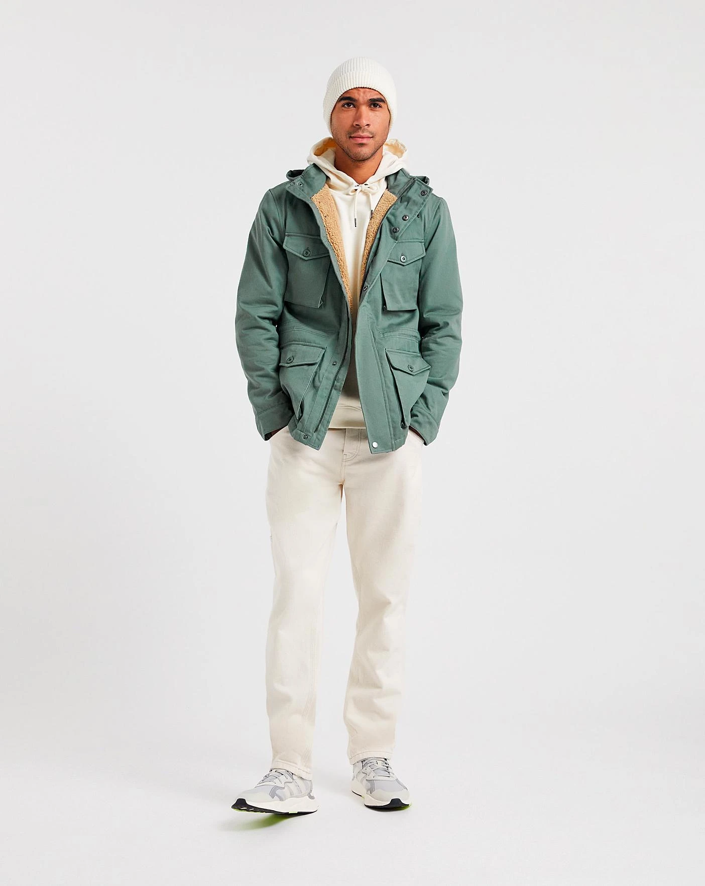 This sage green cotton jacket features a sherpa interior on the chest so its keeps you warm in cooler weather. It also features frontal patch pockets and an internal waist drawcord to give you some shape. The hood is detachable making it very versatile and it can be styled in a range of ways. There is also button wrist adjusters for your comfort.