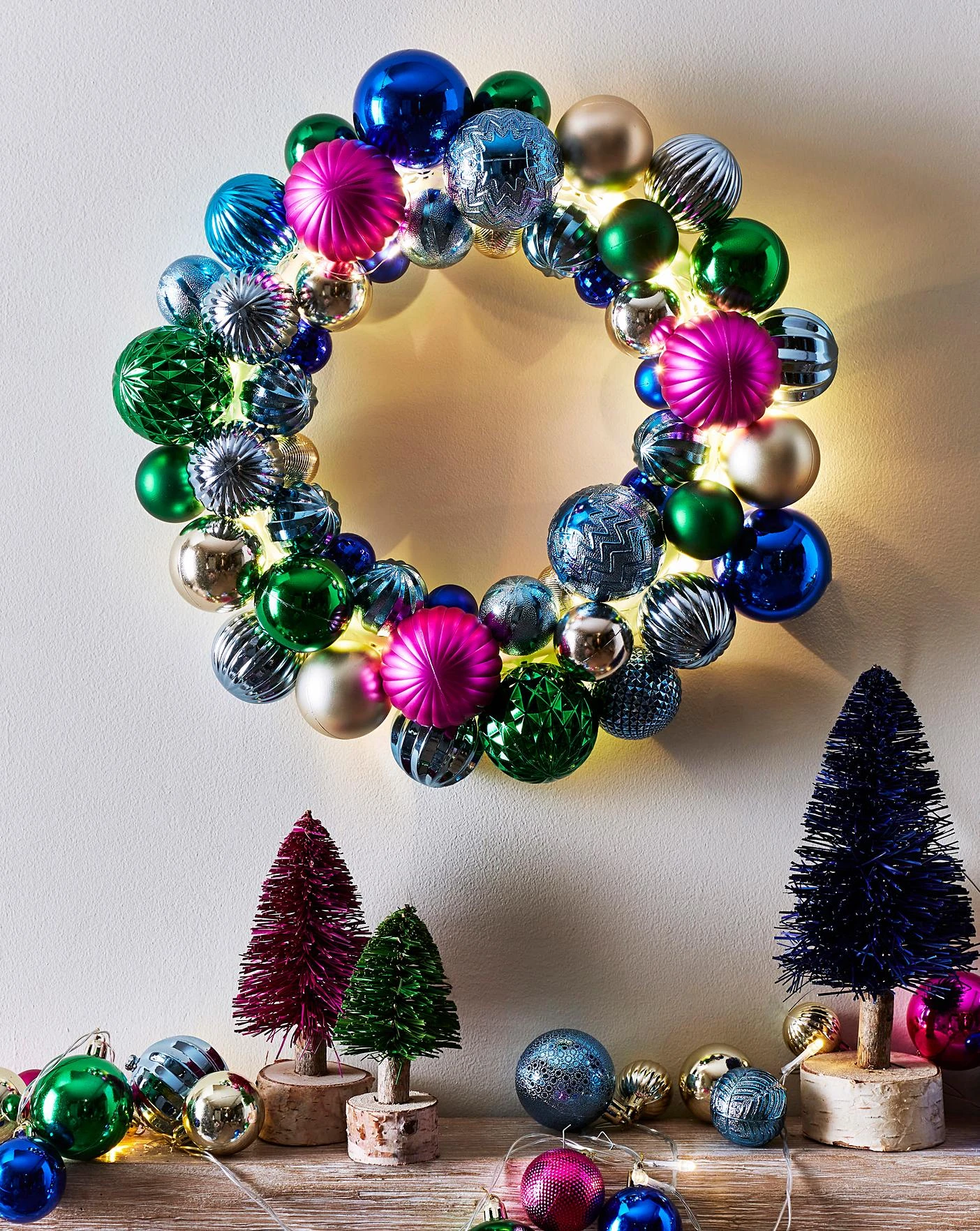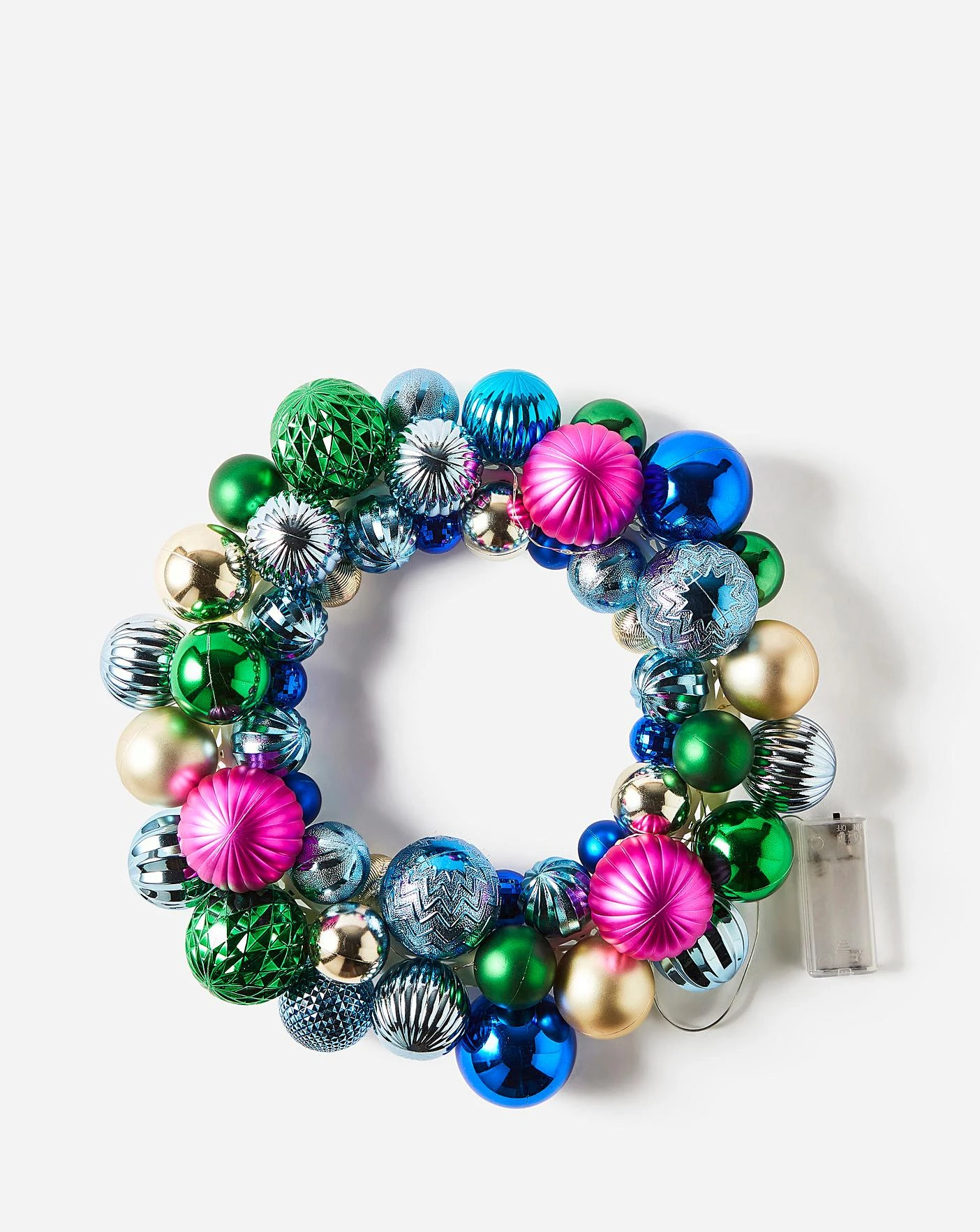 Multicolour Lit Bauble Wreath is made from mild steel and plastic. This set has mixed design baubles in a bold multicolour finish. Suitable for indoor use and requires X2 AA batteries which are not included. Wipe clean with a soft dry cloth.