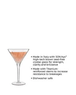 Mixology glassware from Luigi Bormioli features a contemporary cut glass design. Made in Italy with SON.hyx high-tech blown lead-free crystal glass for strength, clarity and brilliance, these four glasses are dishwasher safe and keep their sparkle, perfect serving a classic martini and other cocktails. They’re made with Titanium-reinforced stems to increase resistance to breakages, with an embossed patterned finish.