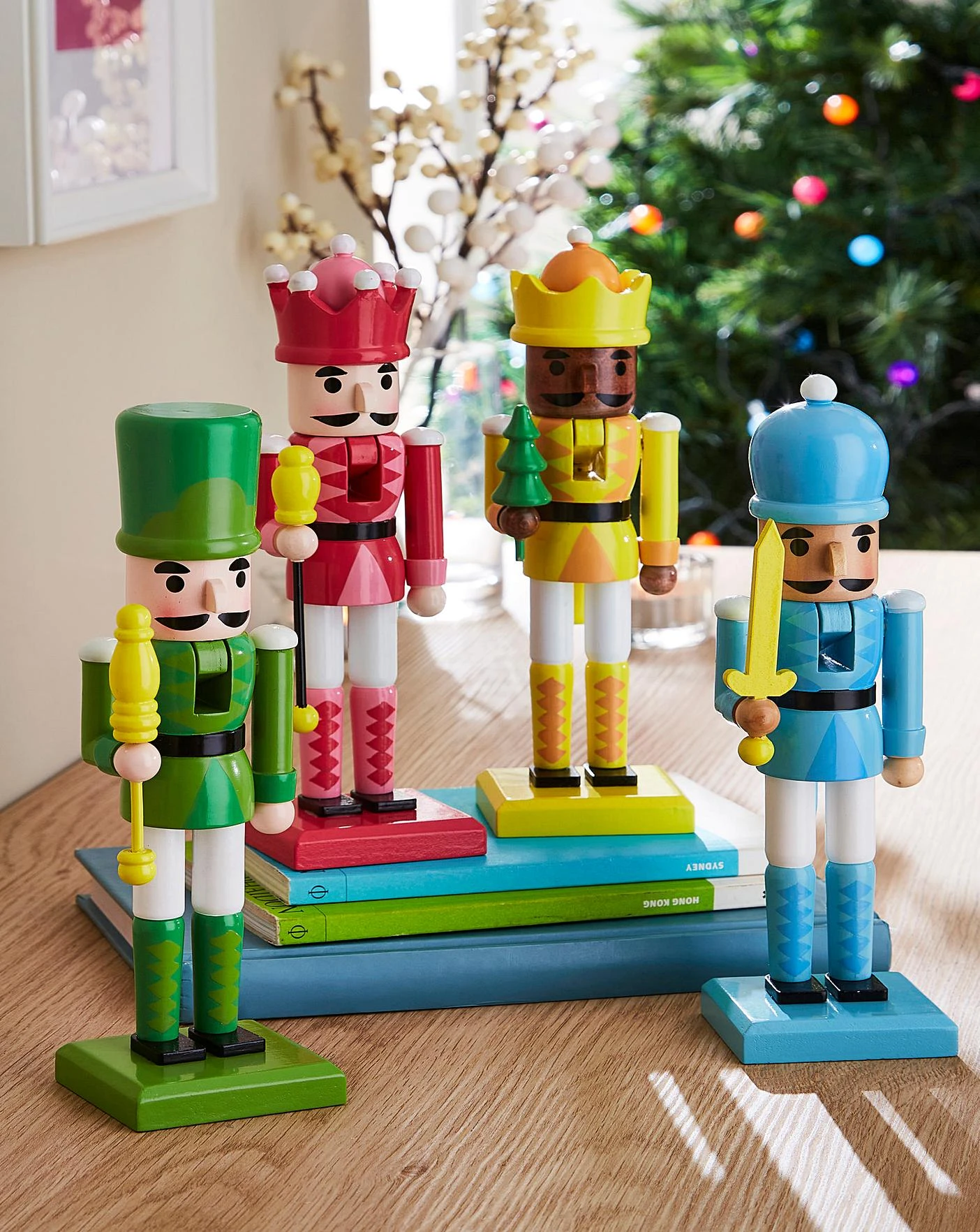 Set of 4 Merry and Bright Nutcrackers made of painted wood. Indoor use only. These are not toys and for decoration purposes only. Wipe clean with a soft dry cloth.