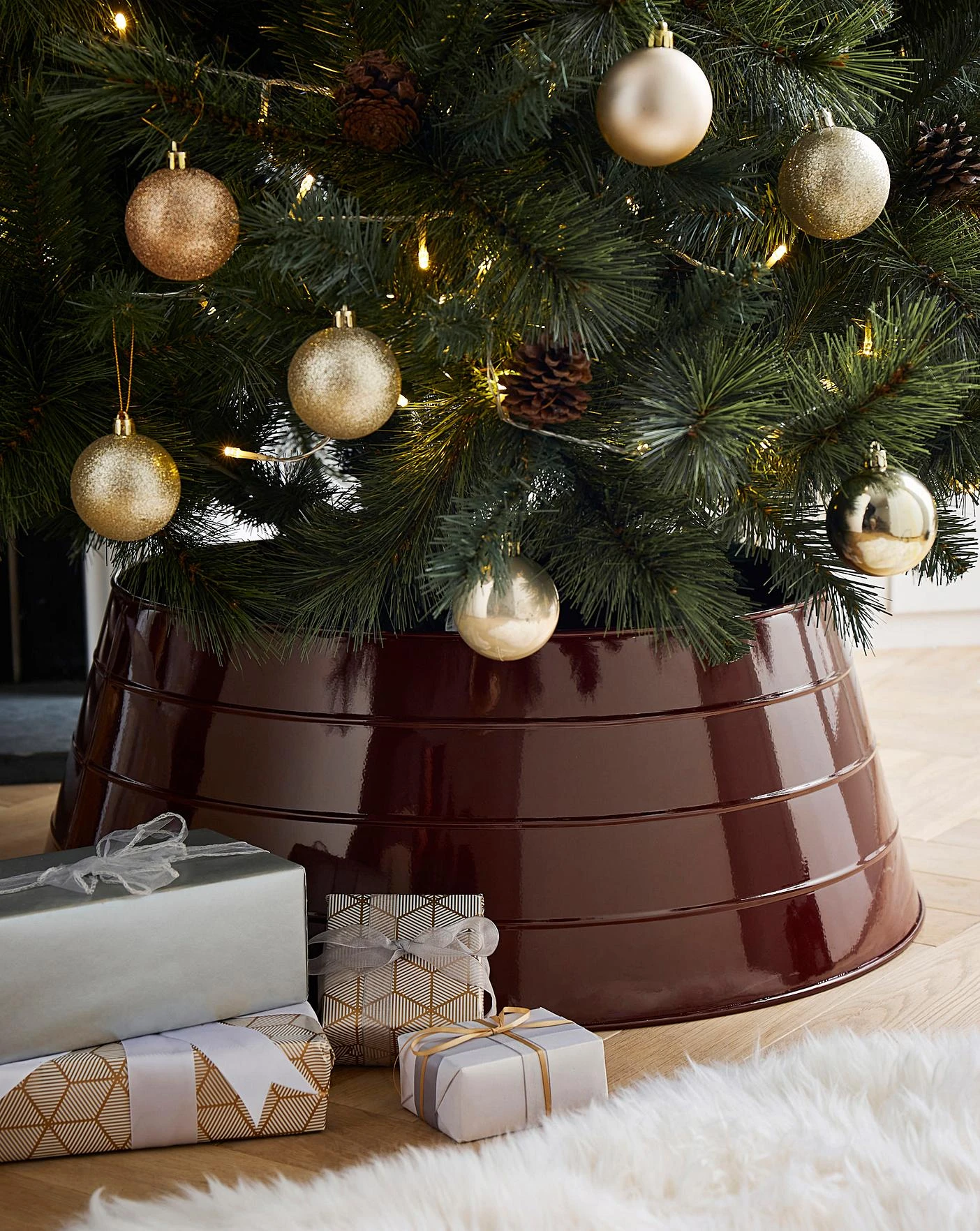 Ivyline metal Christmas tree skirt made from iron and measures H26cm x W72cm x D67cm. Rust resistant. Indoor use only. Wipe clean with a damp cloth.