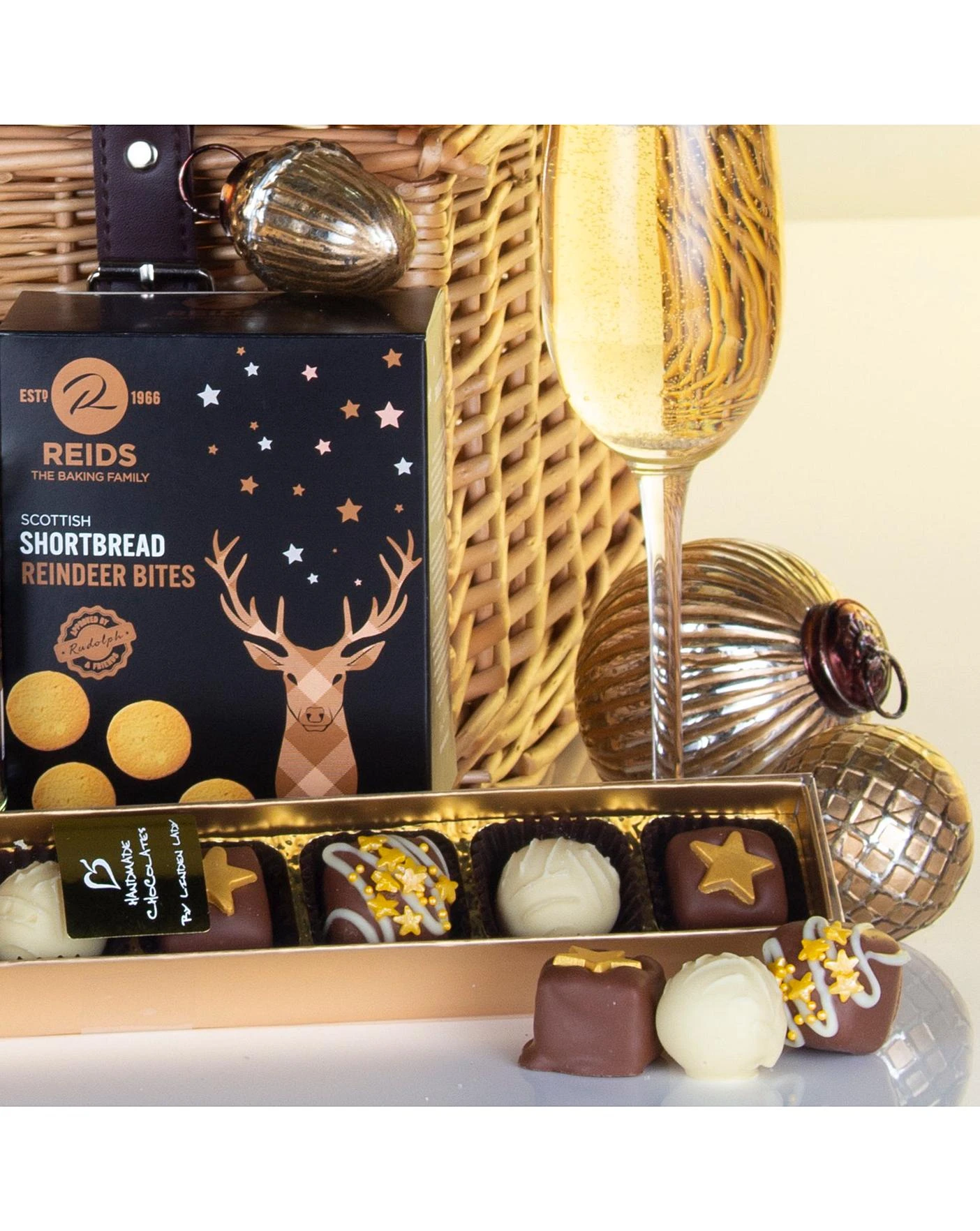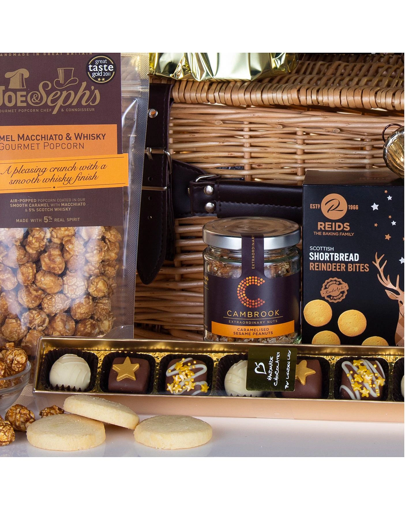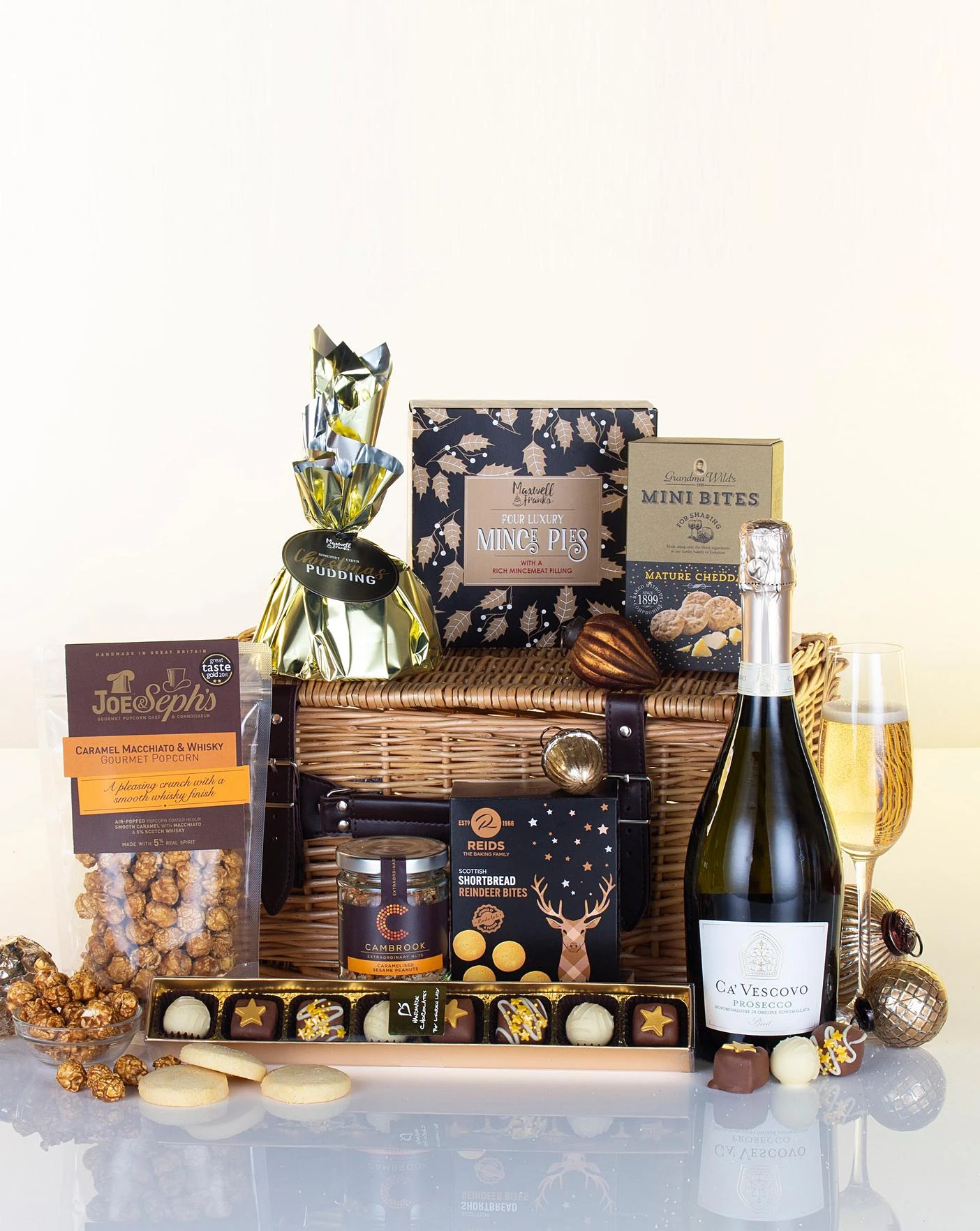 Cambrook Brilliantly Caramelised Sesame Peanuts 80g, Grandma Wild’s Mature Cheddar Mini Bites 100g, Joe & Seph’s Caramel Macchiato Popcorn with Scotch Whisky 70g, Linden Lady 8 Decorated Chocolates 100g, Maxwell & Franks 4 Mince Pies, Maxwell & Franks Christmas Pudding 350g, Reids Shortbread Reindeer Bites 150g, Prosecco Brut Ca’Vescovo Italy 75cl 11% vol, Traditional Lidded Wicker Basket.