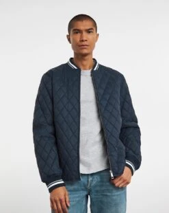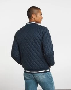 The navy diamond quilted bomber jacket is the perfect transitional jacket. It’ll keep you looking stylish as well as warm this season. It features a full length zip, two side pockets and a cuffs and back hem. Length: 27inches/69cms