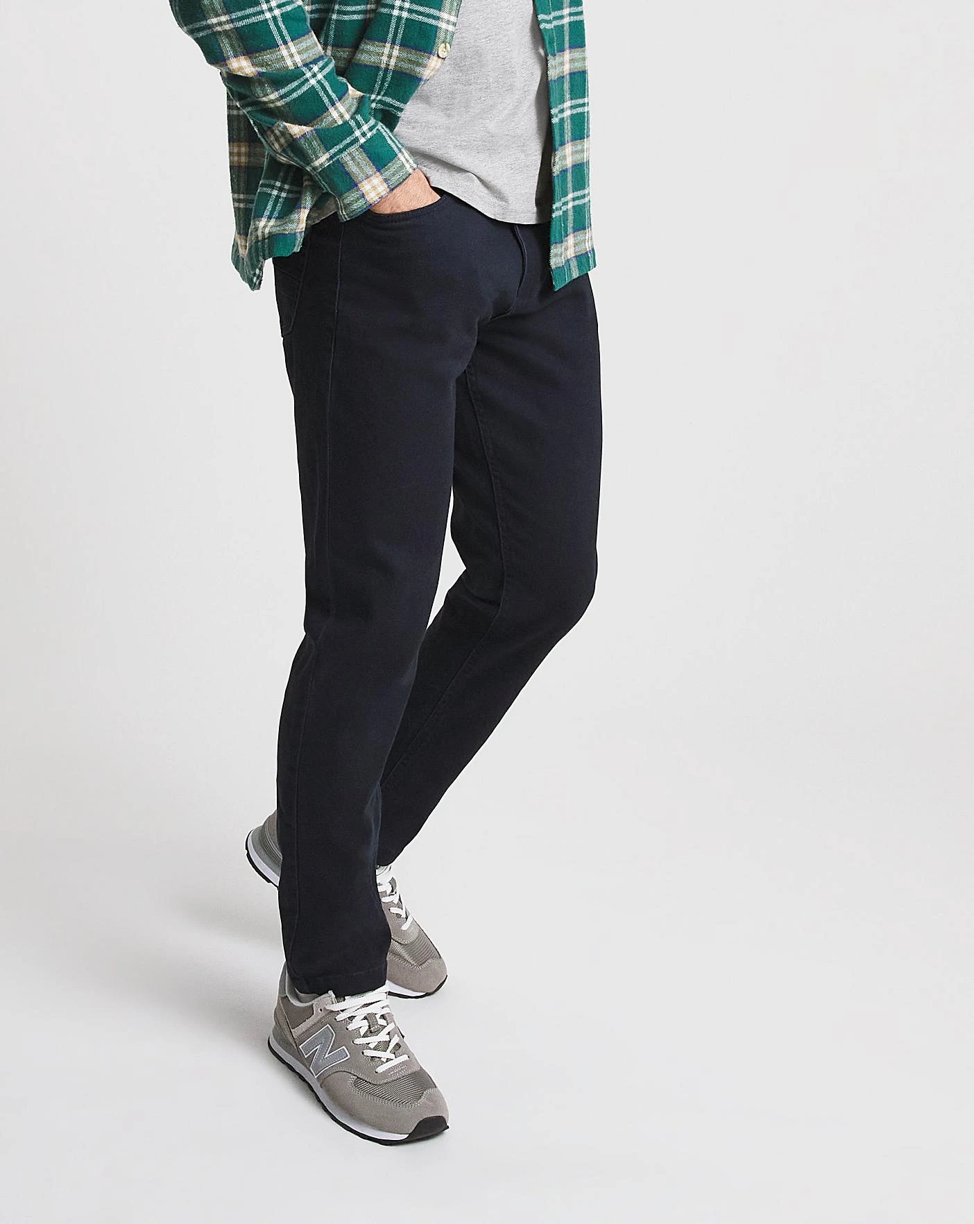 Slim fit gabardine jeans in navy with two front and two rear pockets and a zip/button fly fasten.