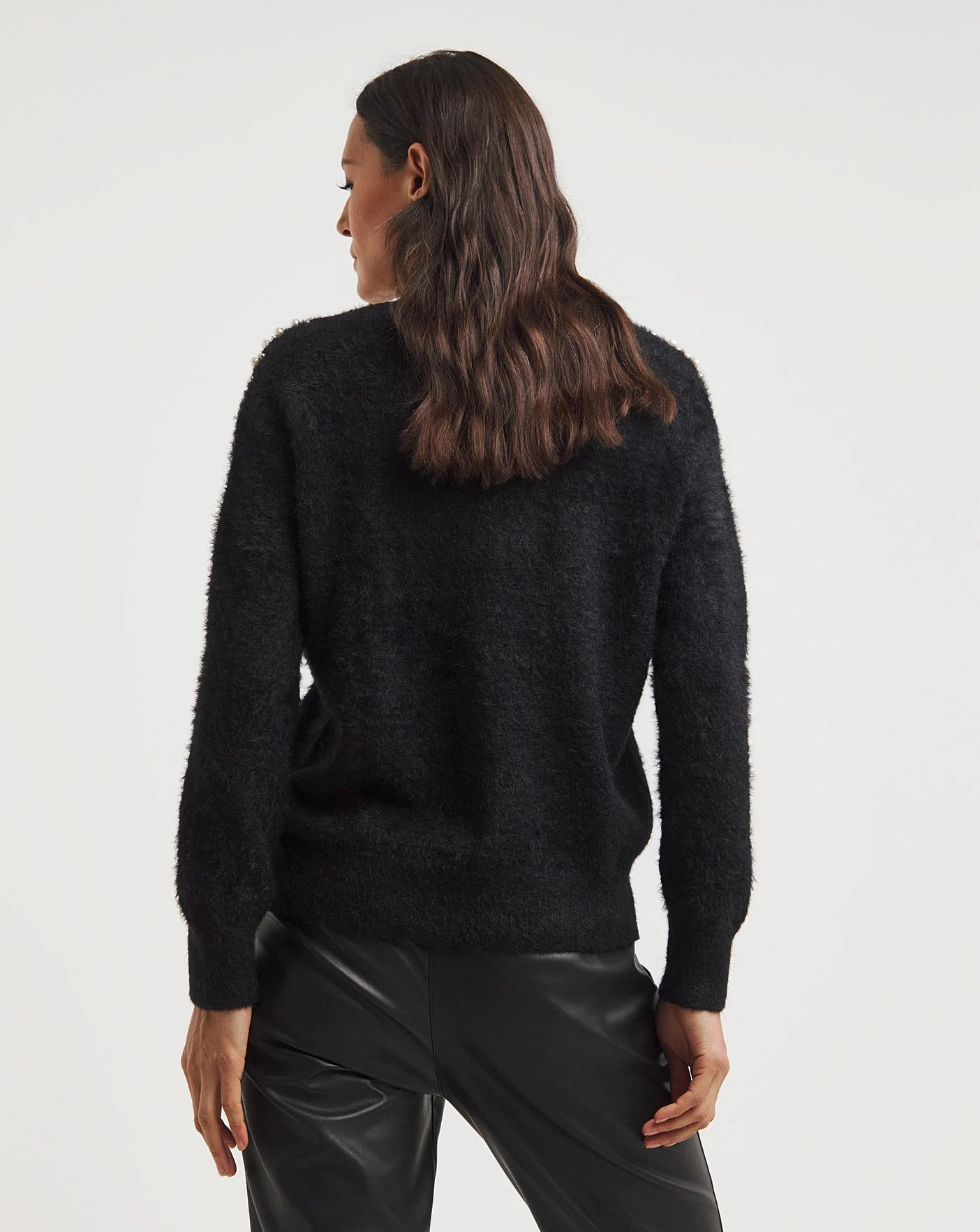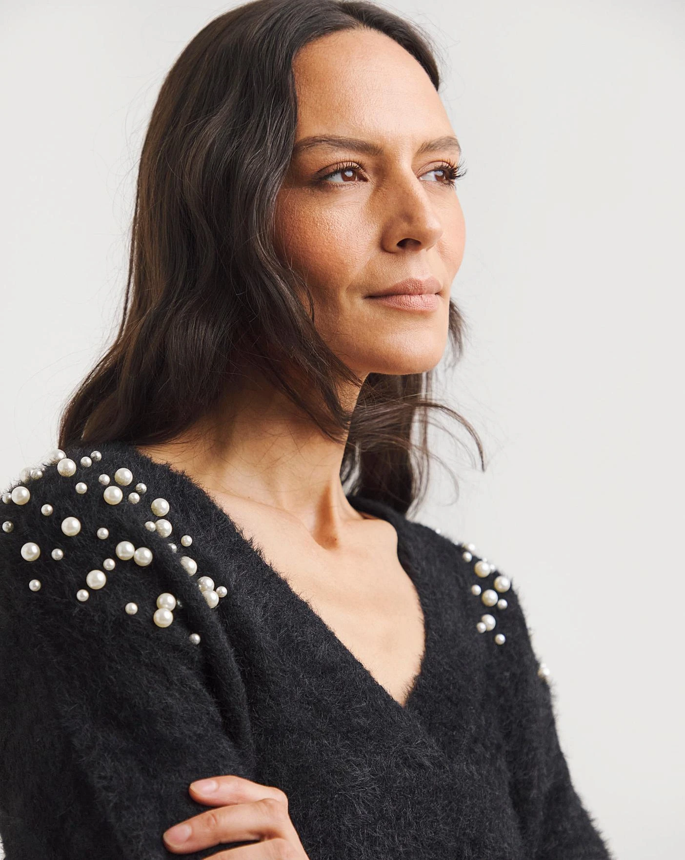A wardrobe essential throughout December wrap up in this Embellished V Neck Fluffy Jumper. Featuring long sleeves and an decorative festive pattern. Pair with jeans and boots.