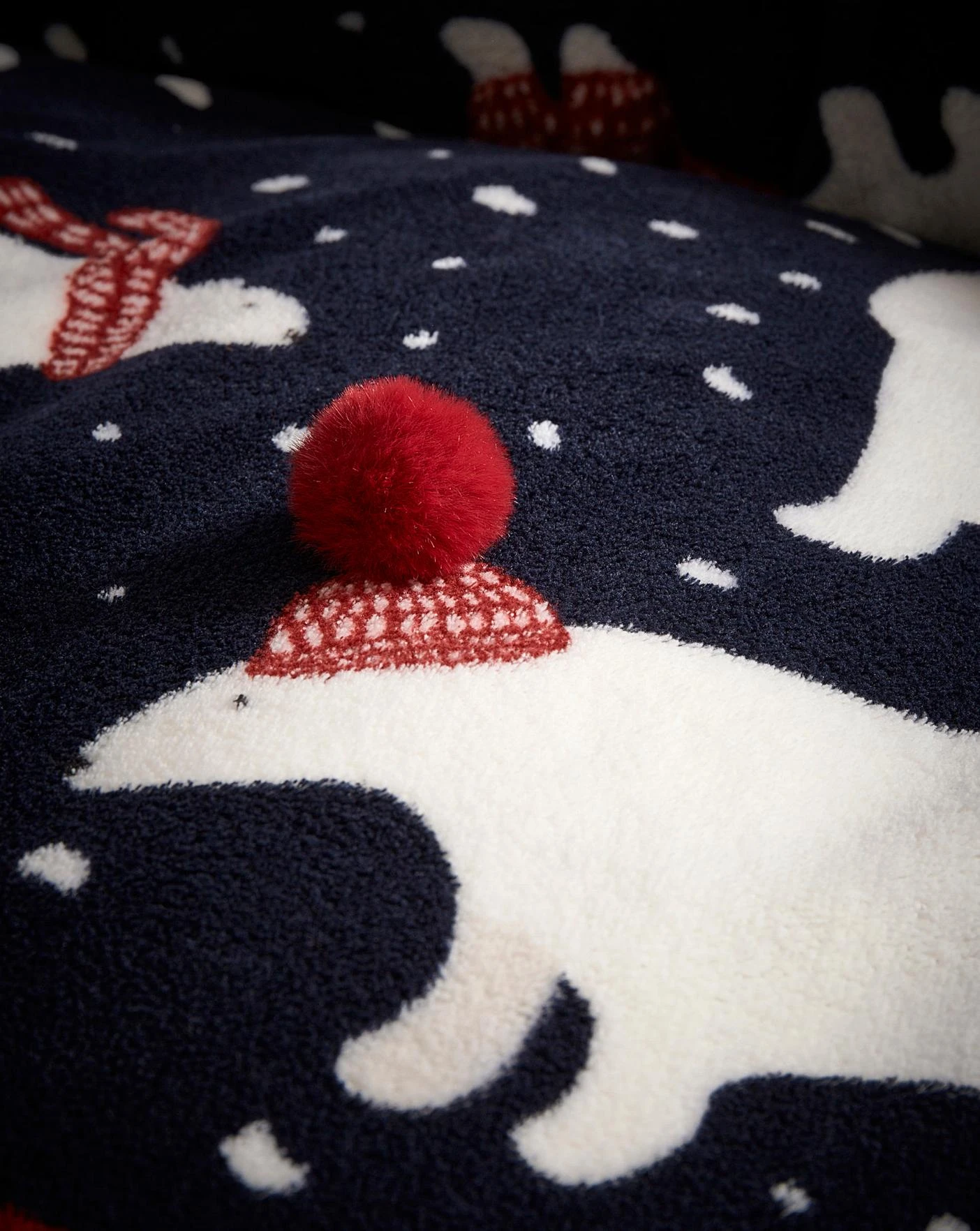 The Polar Bear Pom Pom Fleece bedding set features an accesorised polar bear motif repeat print with a contrast reverse. The set includes 2x pillowcases (1x single), 1x duvet cover.