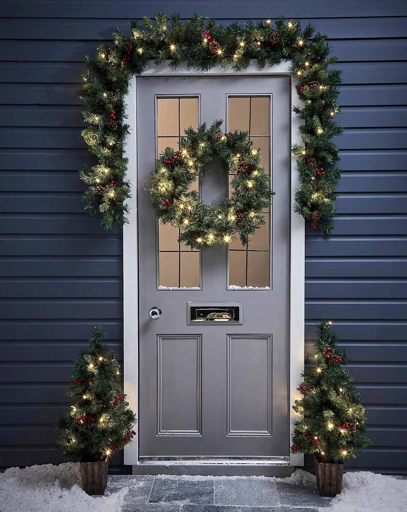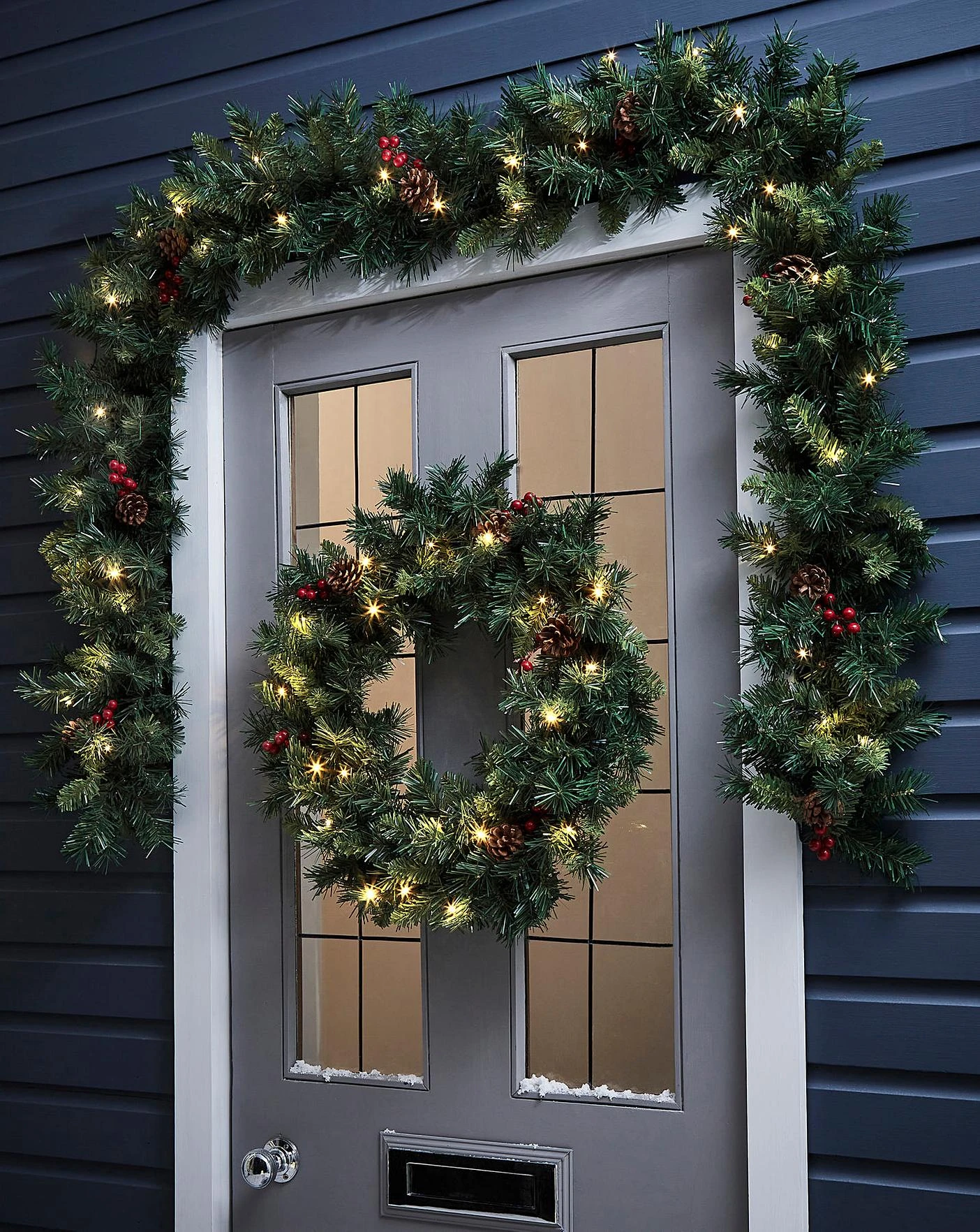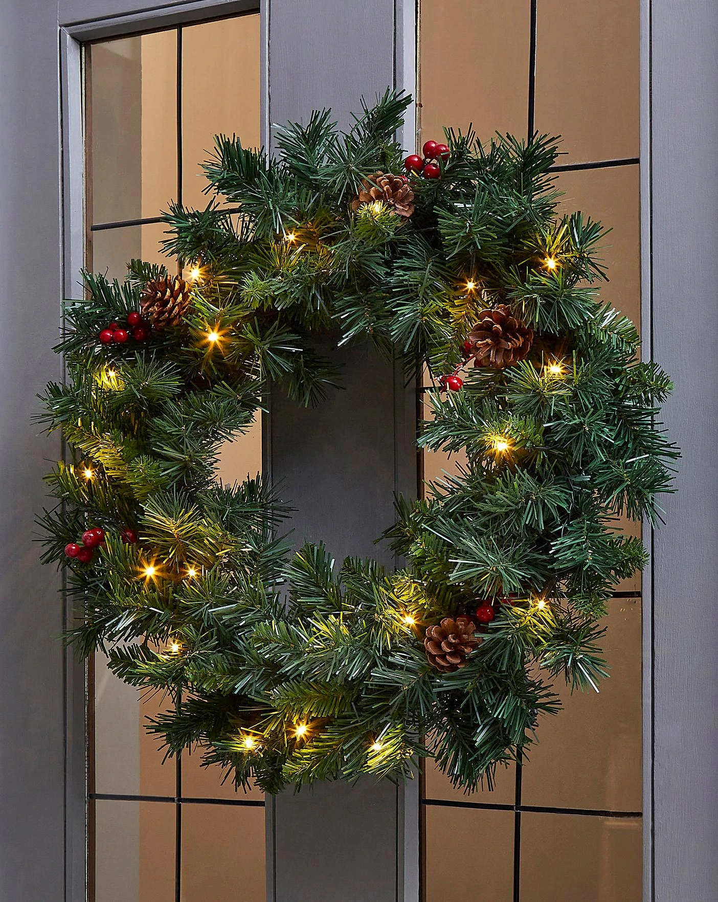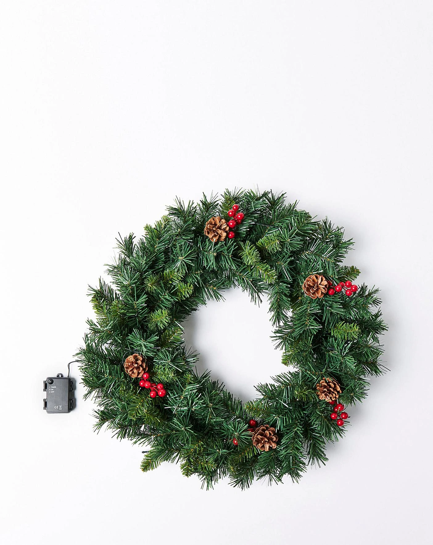 60cm Wreath pre-decorated with berries and cones. Pre-lit with 20 Warm White LEDs and with On/Off and timer function