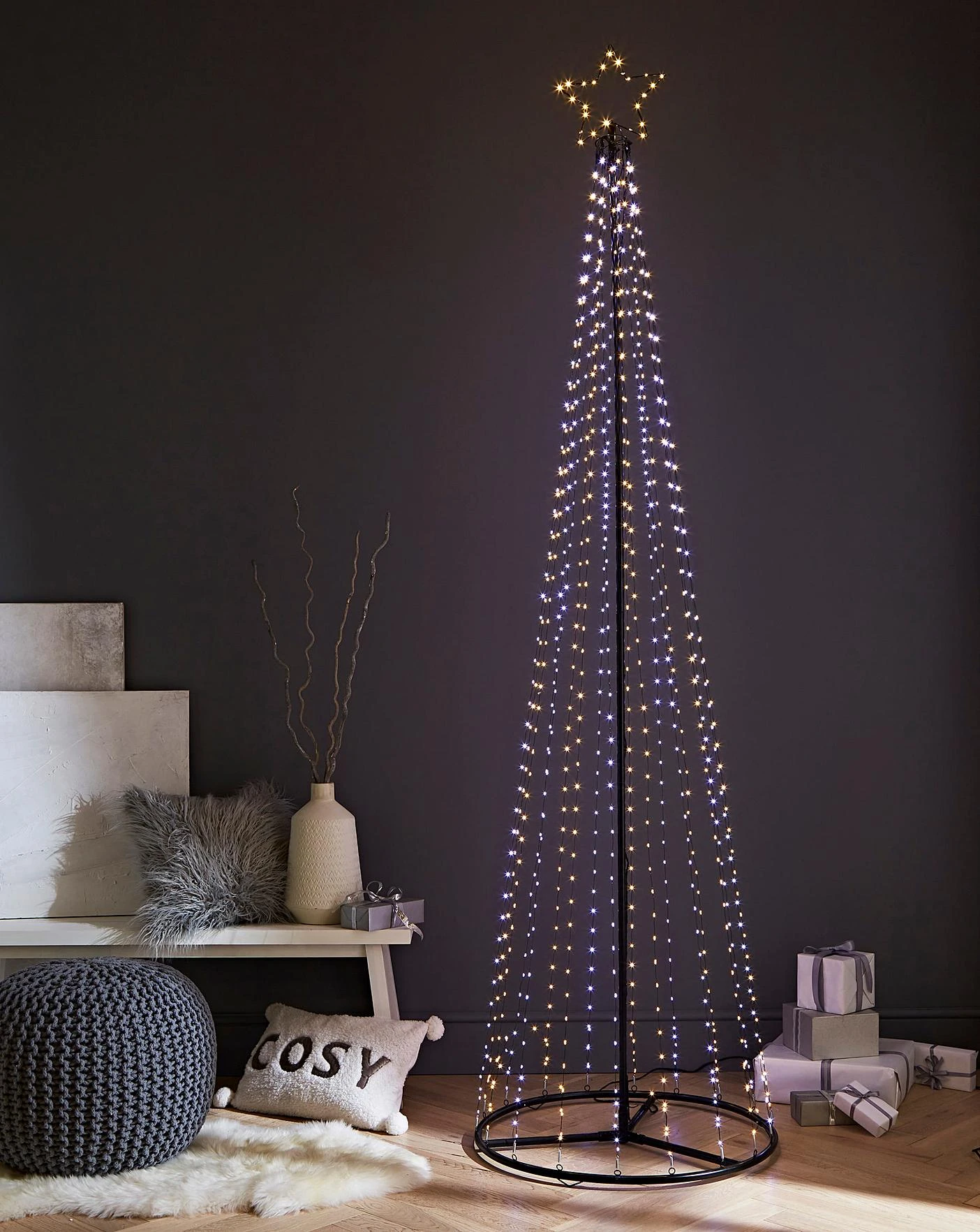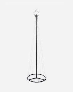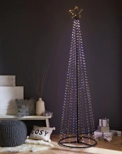 210 CM Tall pyramid tree with pinwire LED lights and star topper. Easy to assemble, hanging each of the 15 pinwire threads down to fix to the tubular frame base. With a total of 595 Warm White and White LEDs offering multi action light functions including static. 10 M cable suitable for indoor or outdoor use.