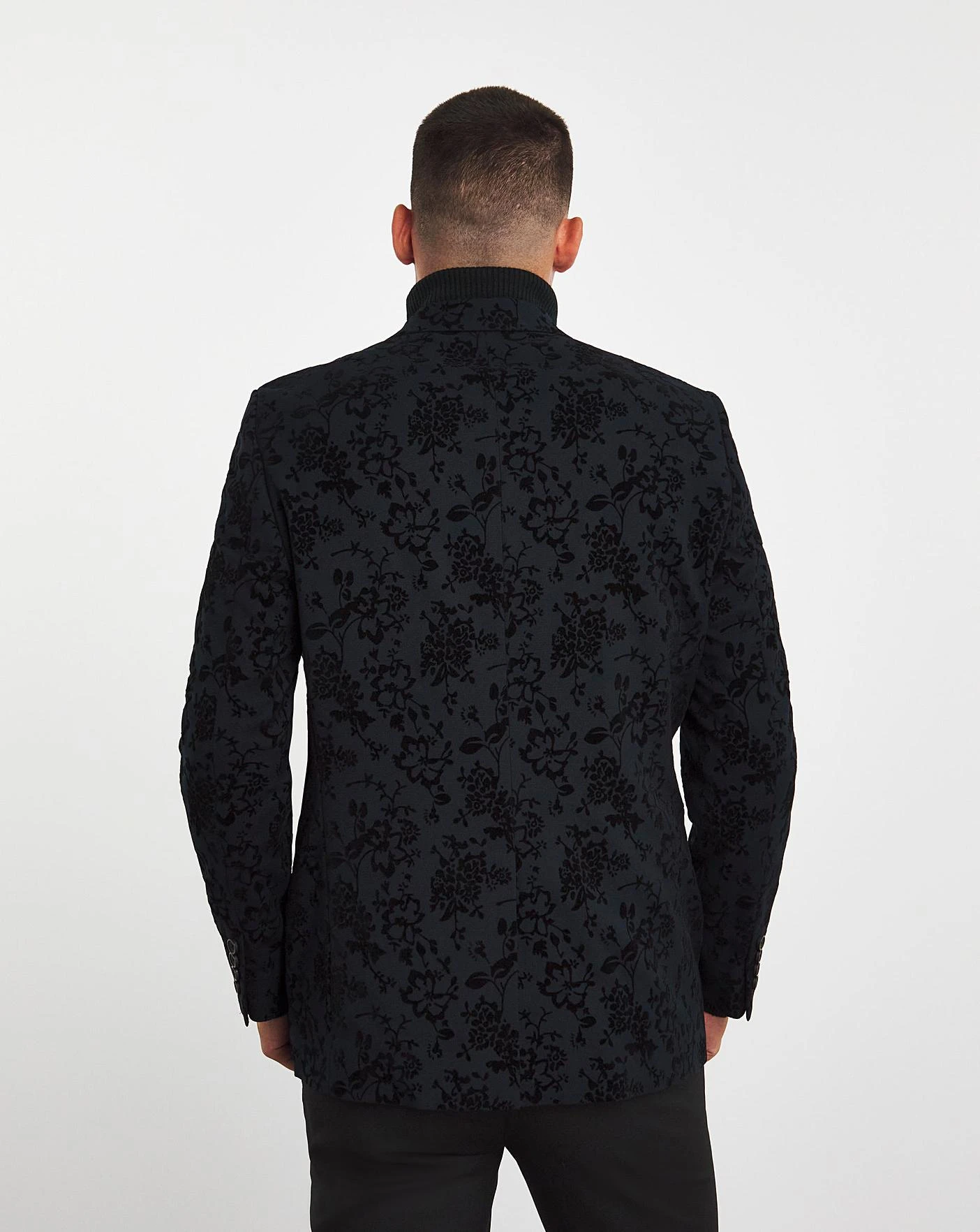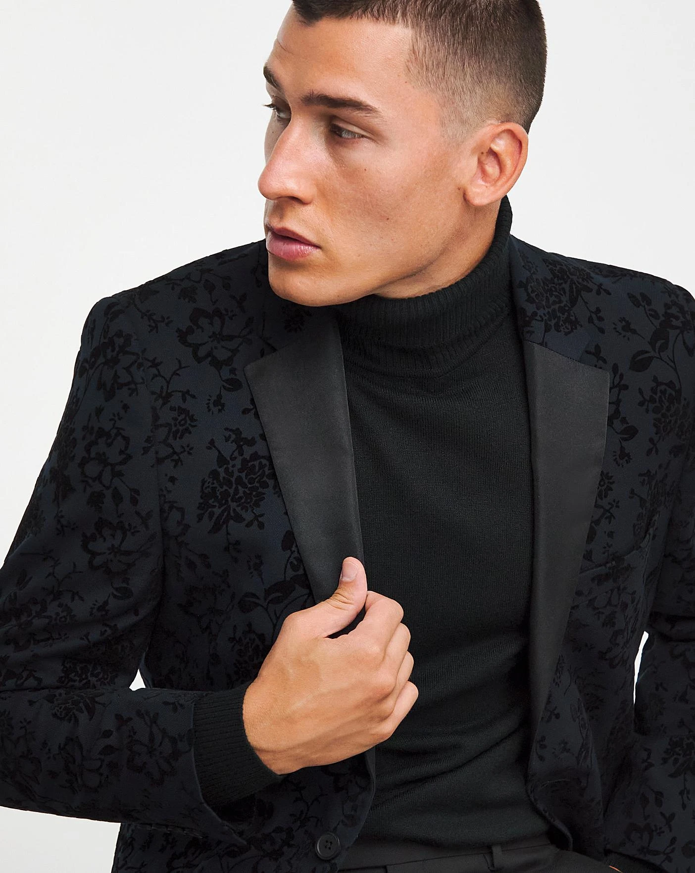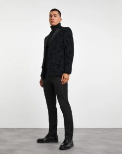 This Satin flock blazer in Navy comes with lapel detaining and a front button fastening. Model is 6’1 and wears a size 40R.