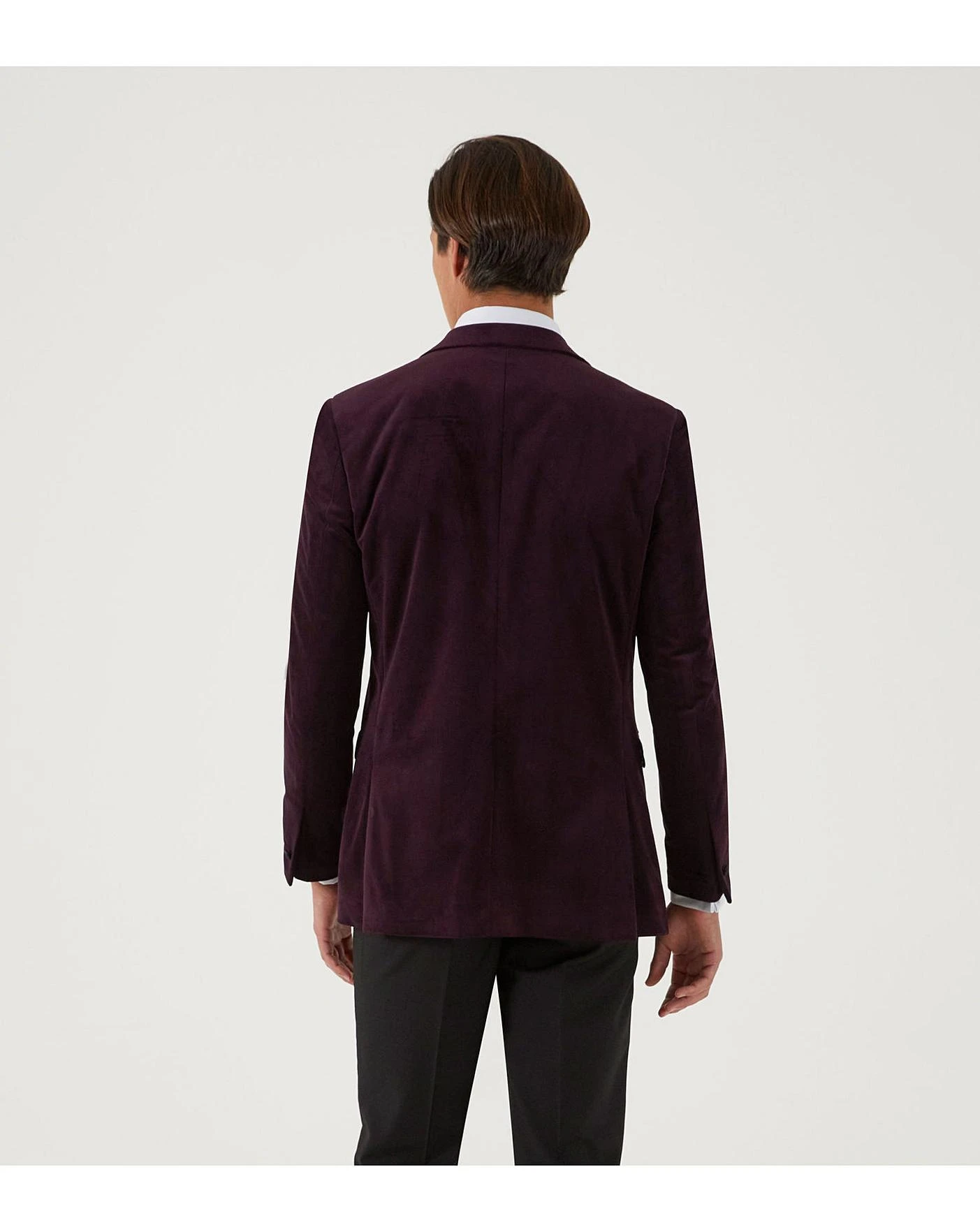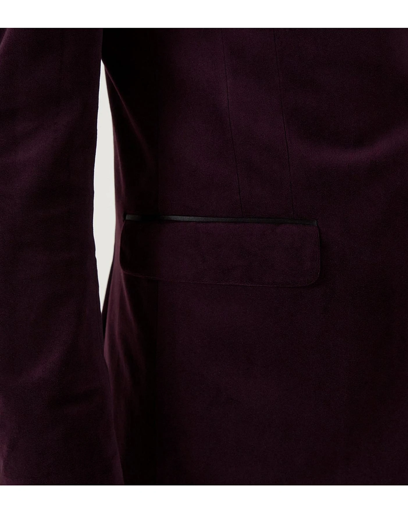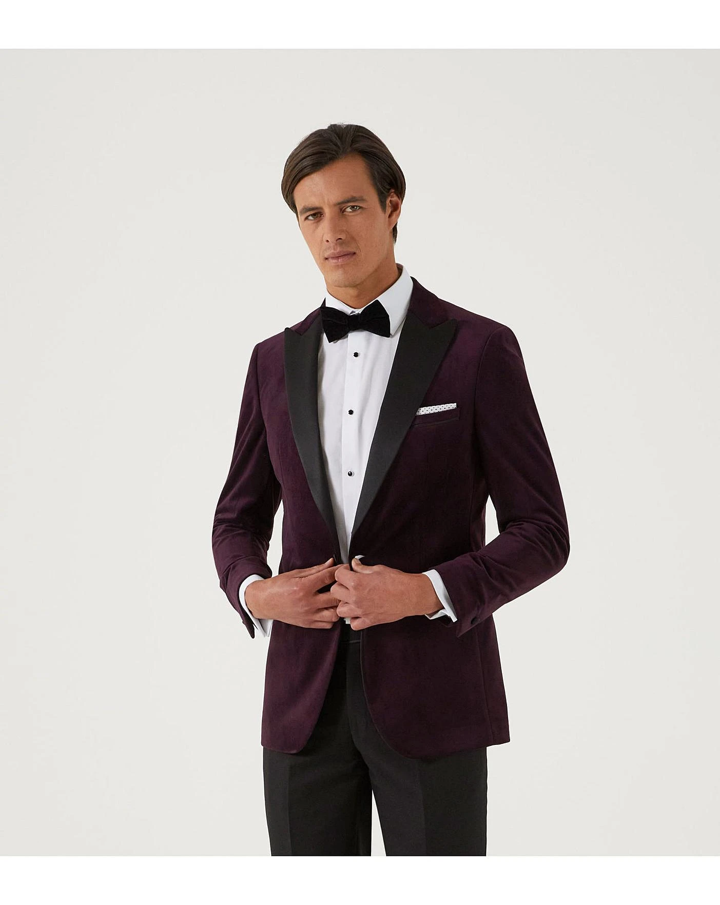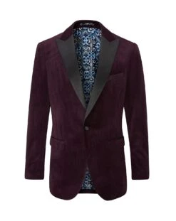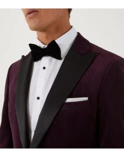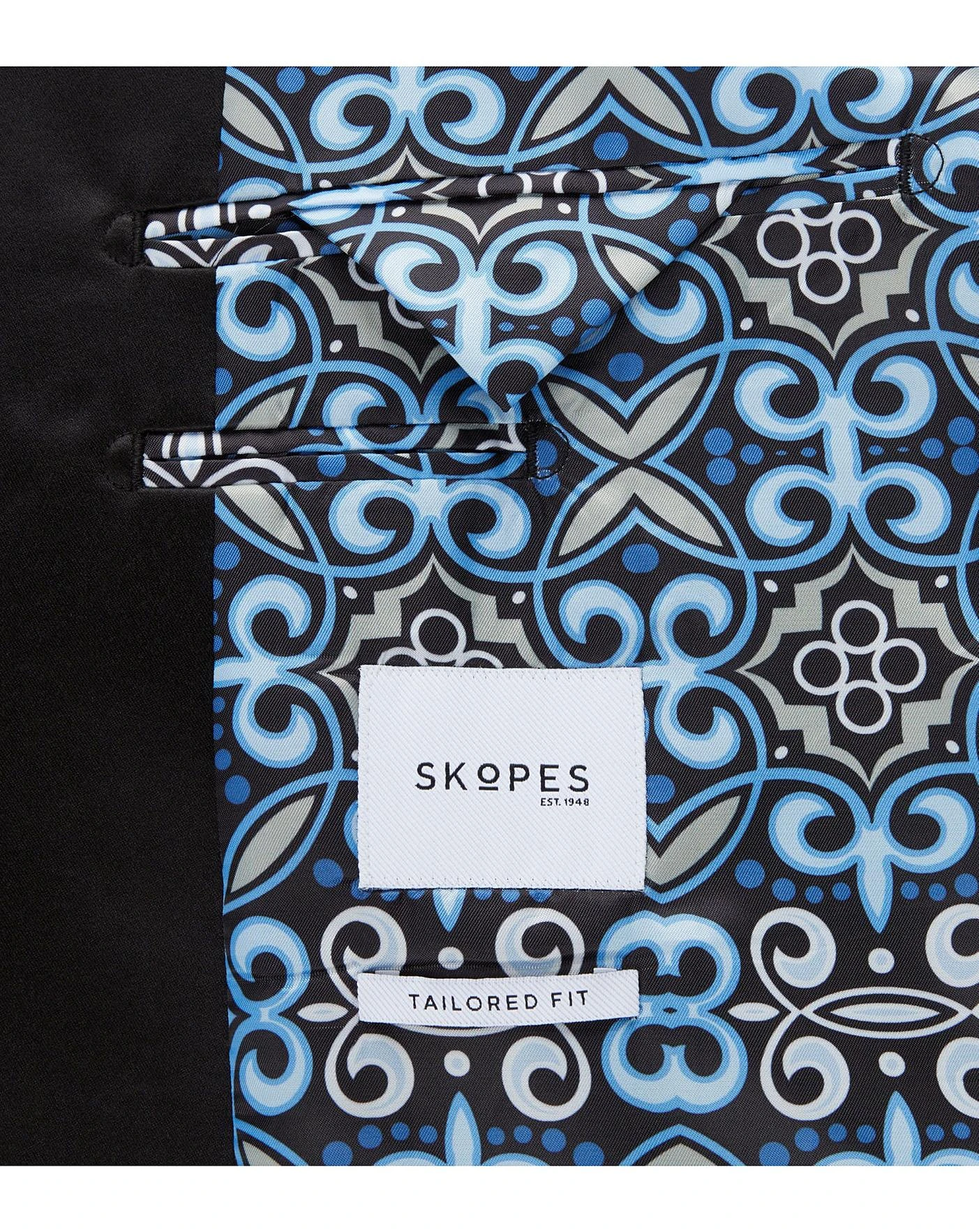 - Features include satin peak lapel, pull out pocket hankie, straight flap waist pockets with trim, cloth covered buttons, geometric pattern lining with twin side vents.