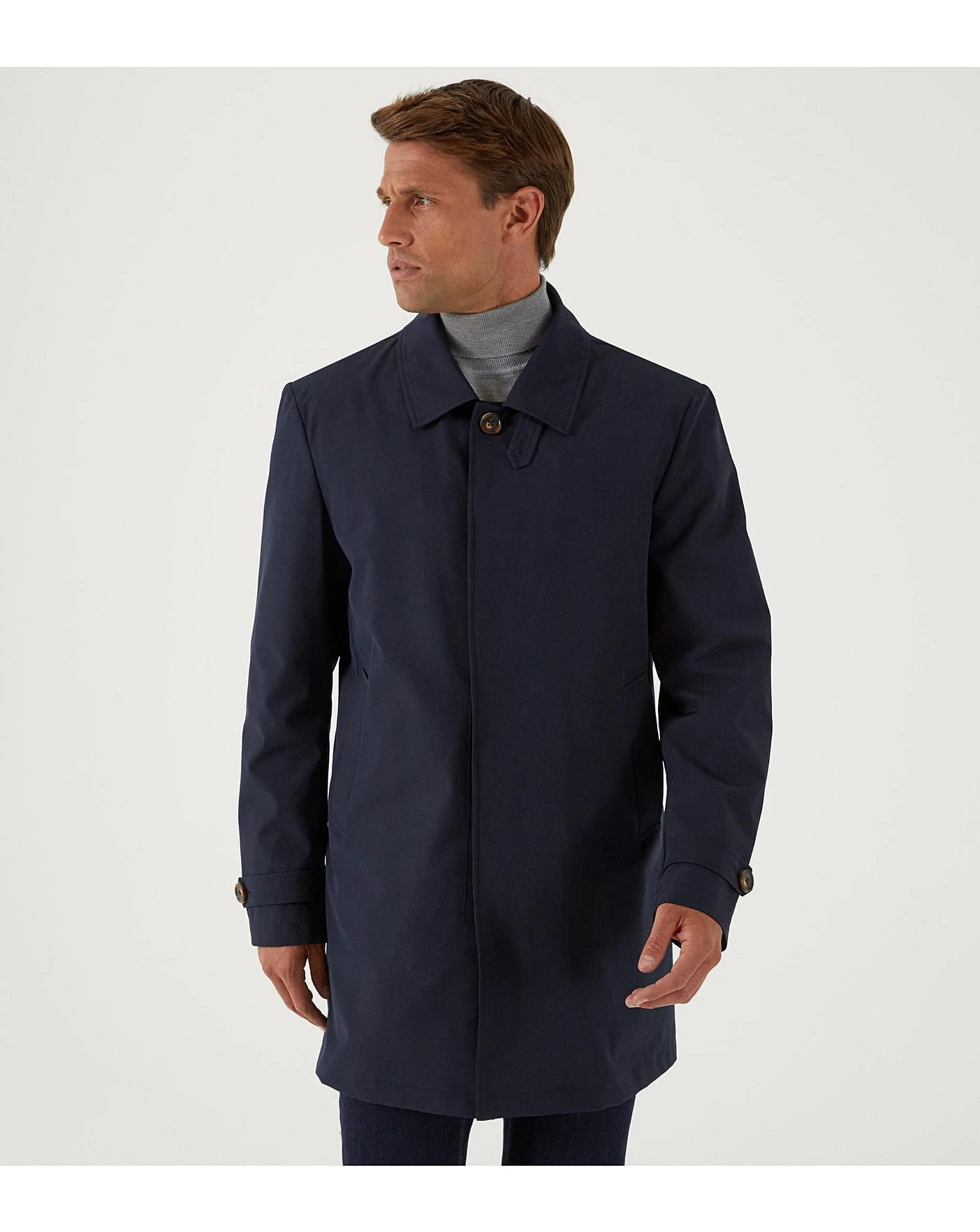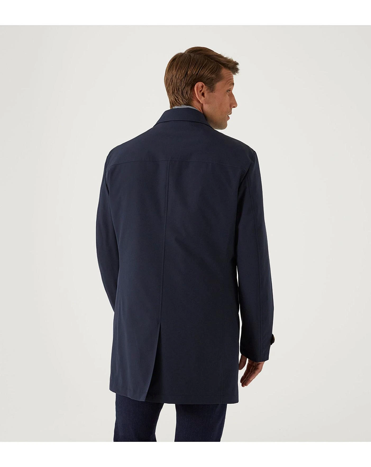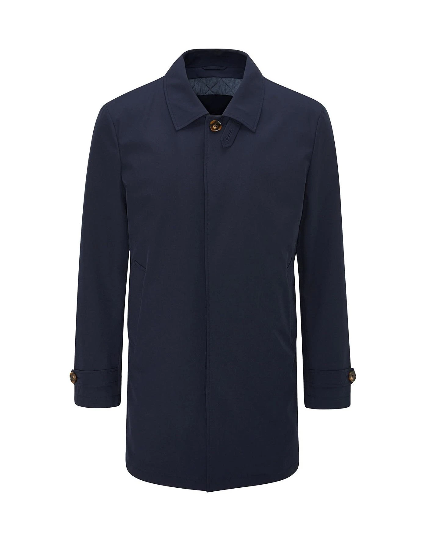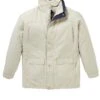 - Features include stretch fabric, side slant pockets, button fastening inside pocket, button fastening cuff and throat tab and quilted lining.Centre back length = 98.5cm on size medium.