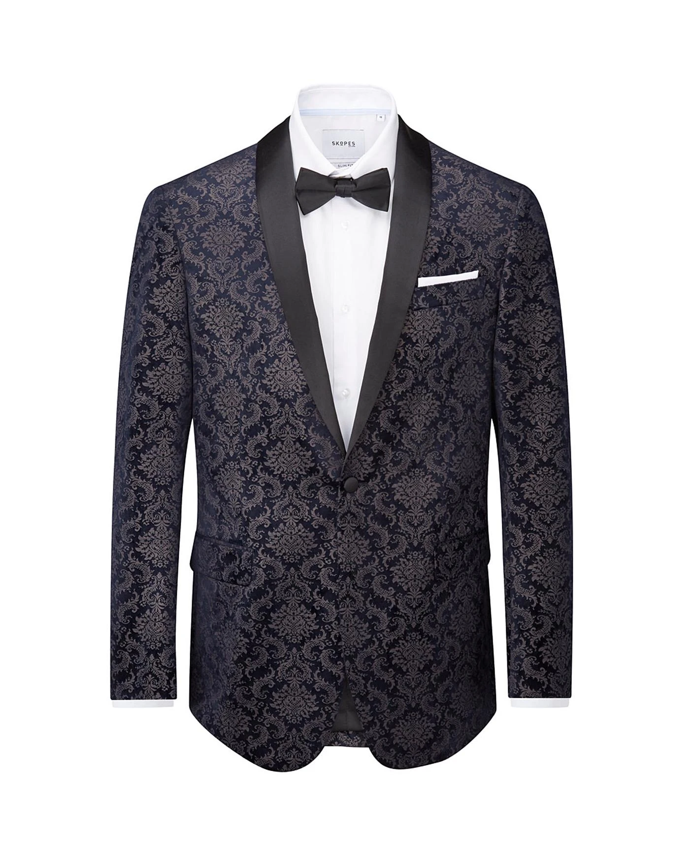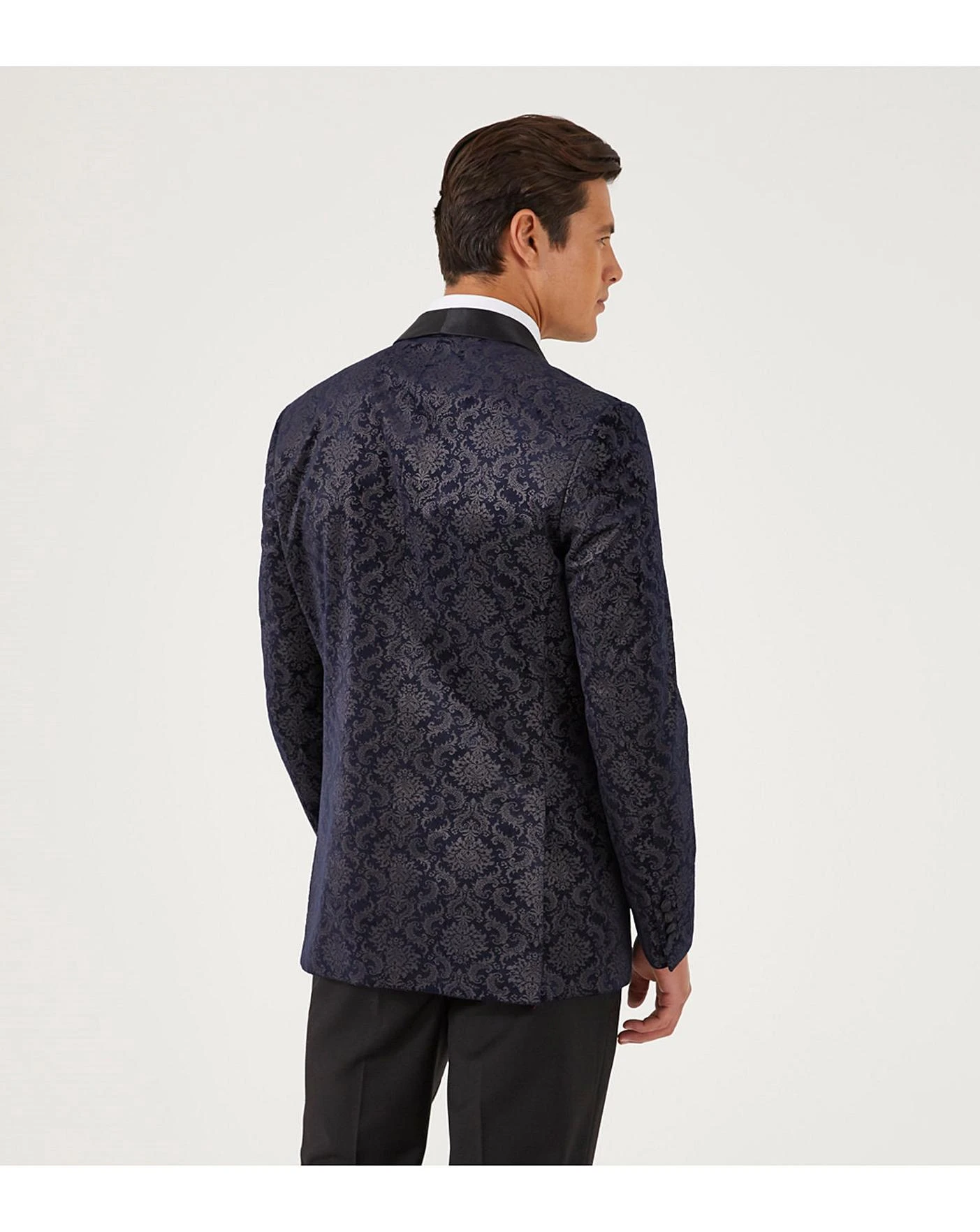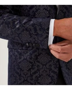 - Single breasted two button tailored fit jacket in navy velvet design.