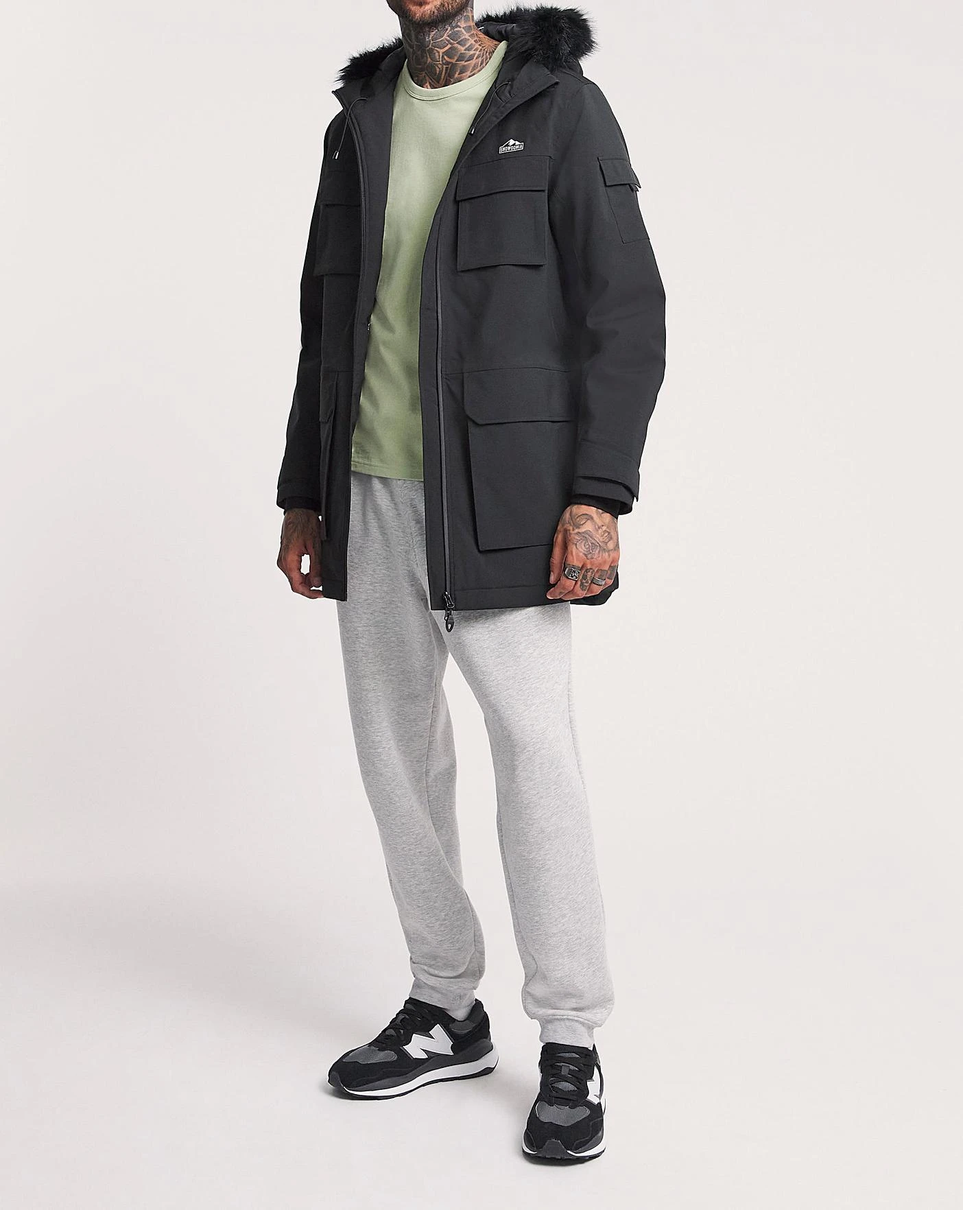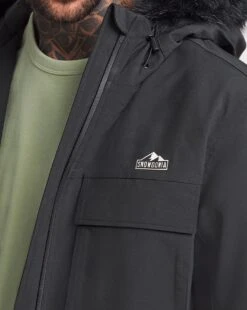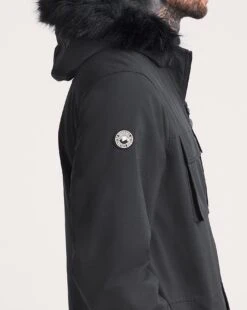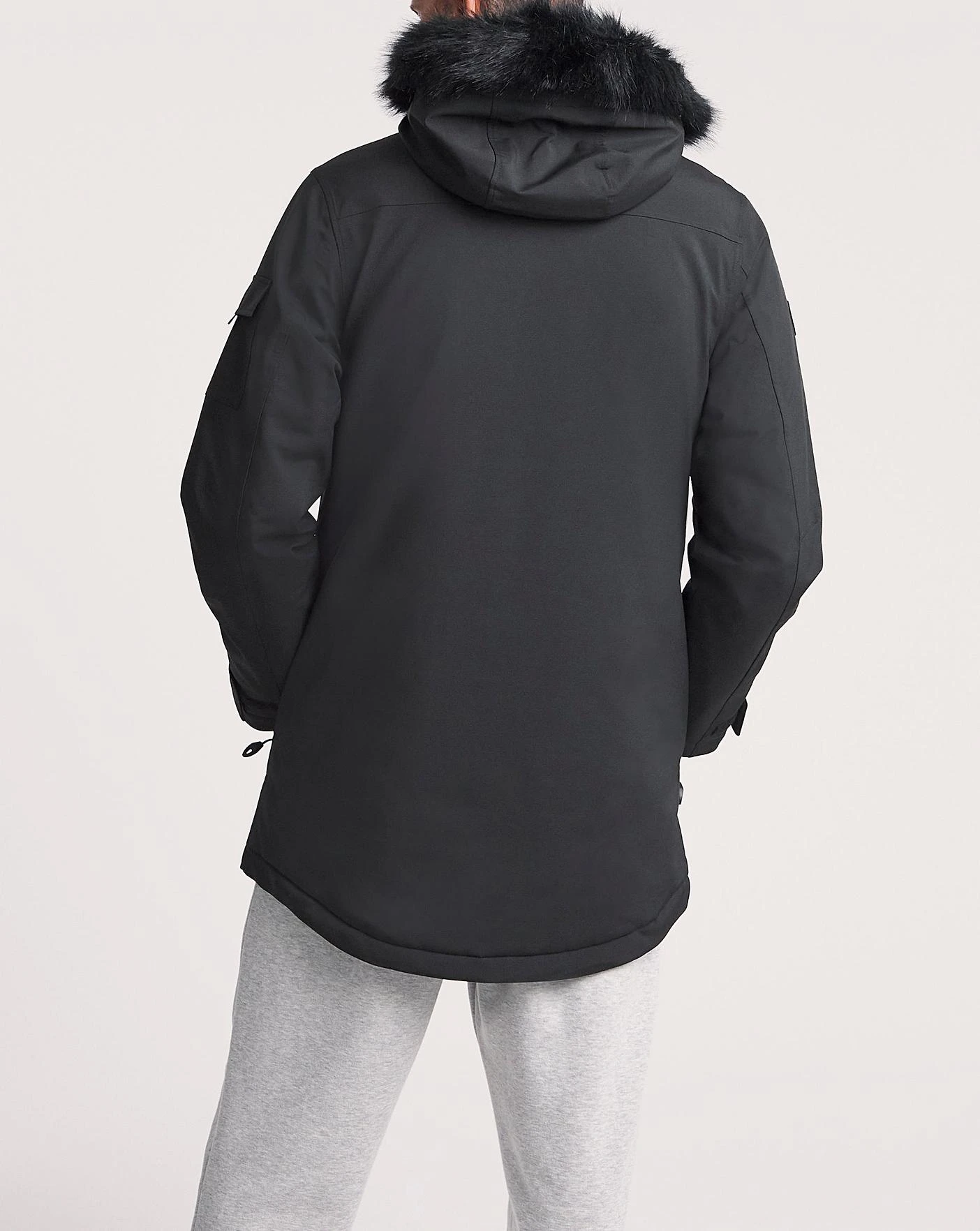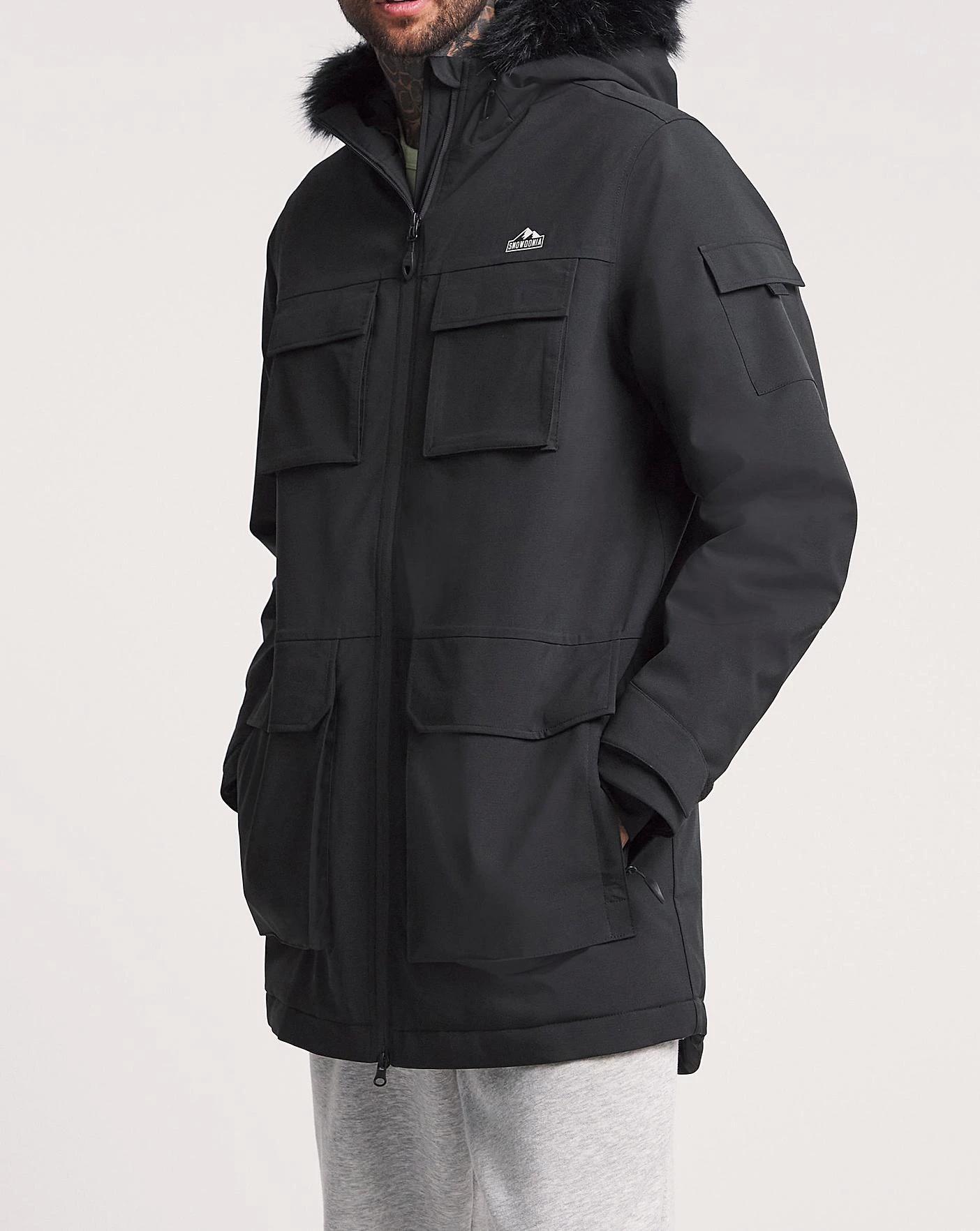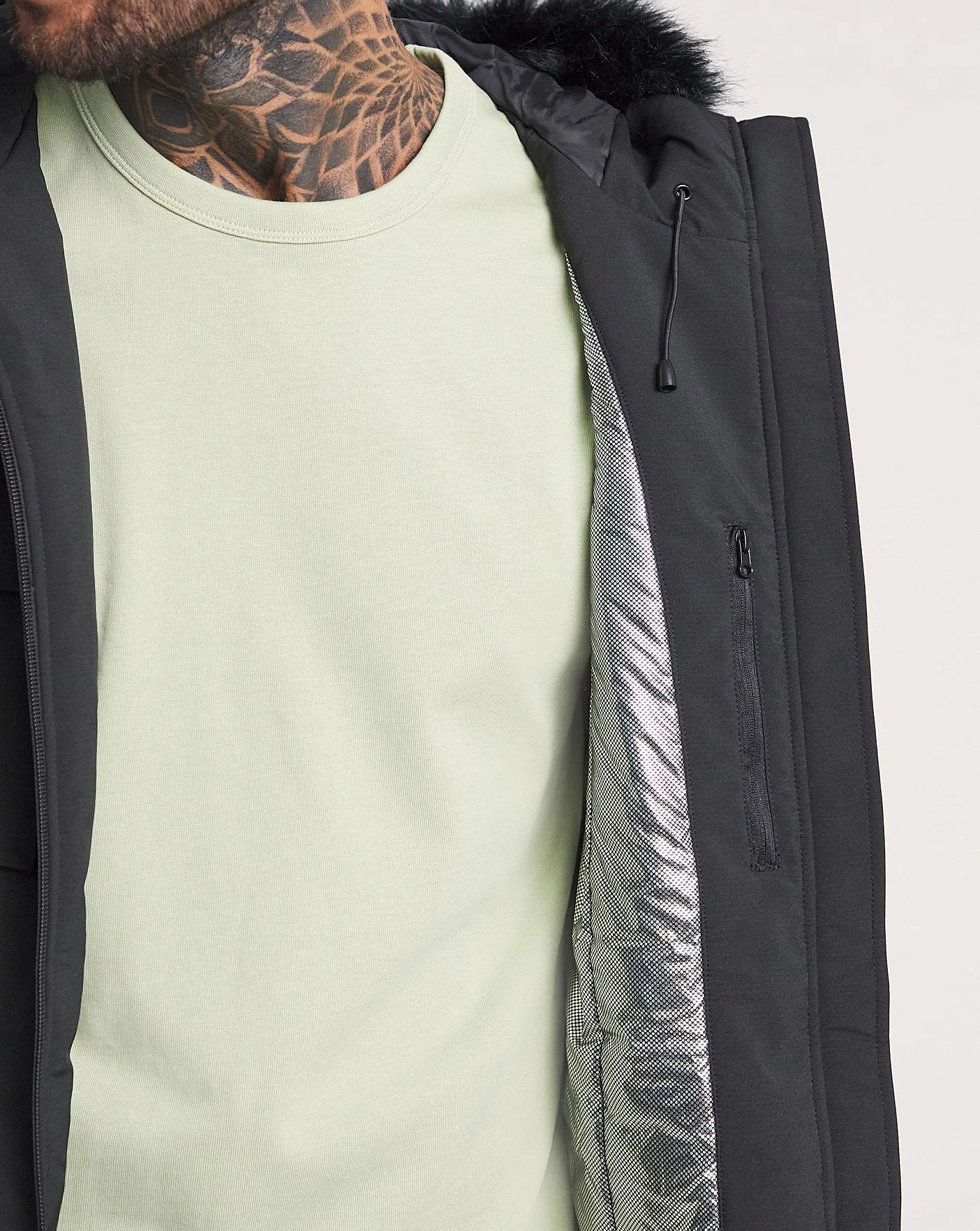 This black snowdonia parka is geared for to keep you warm no matter how low the temperatures drop. It features DuPont insulation and a metallic interior so the heat in sealed in without adding too much bulk. It features many pockets, including on the arm, on the interior and concealed zip pockets on the front. It also has adjustable wrist adjusters.