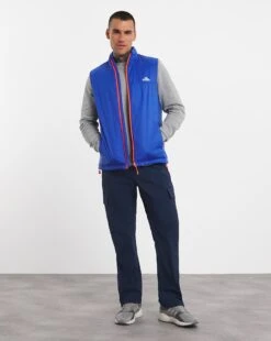 Step into the great outdoors with the blue Snowdonia gilet with red contrasting zips. It uses a water resistant external fabric, has insulating properties and a full zip fastening as well as zip pockets. A great choice to wear during any activity, the sleeveless feature allows for a larger range of movement.