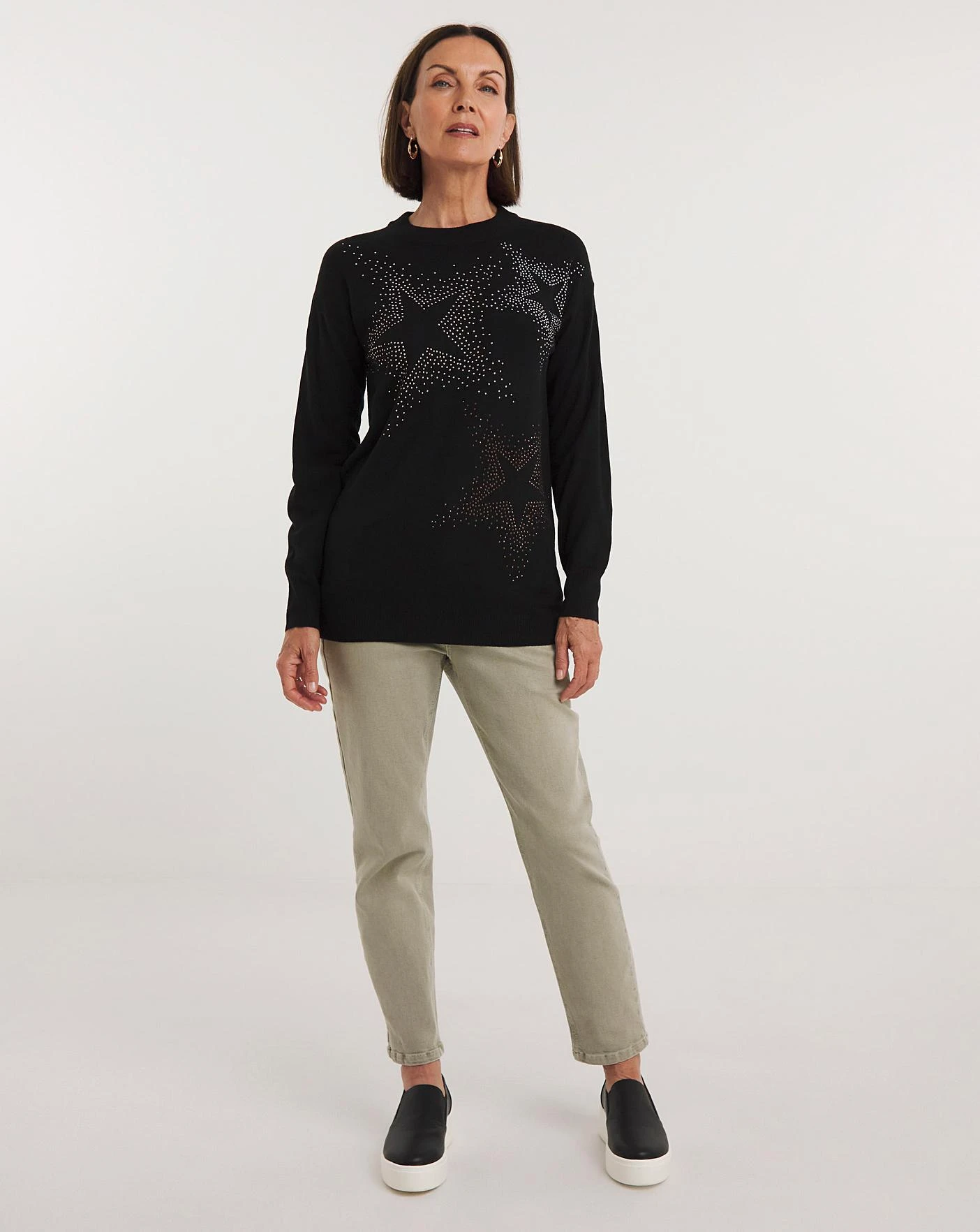 This Star Hot Fix Jumper is the perfect addition to your wardrove this winter. The jumper has a decorative illustration detailing throughout the front of the garment and has full length sleeves for comfort. Perfect for the colder months.