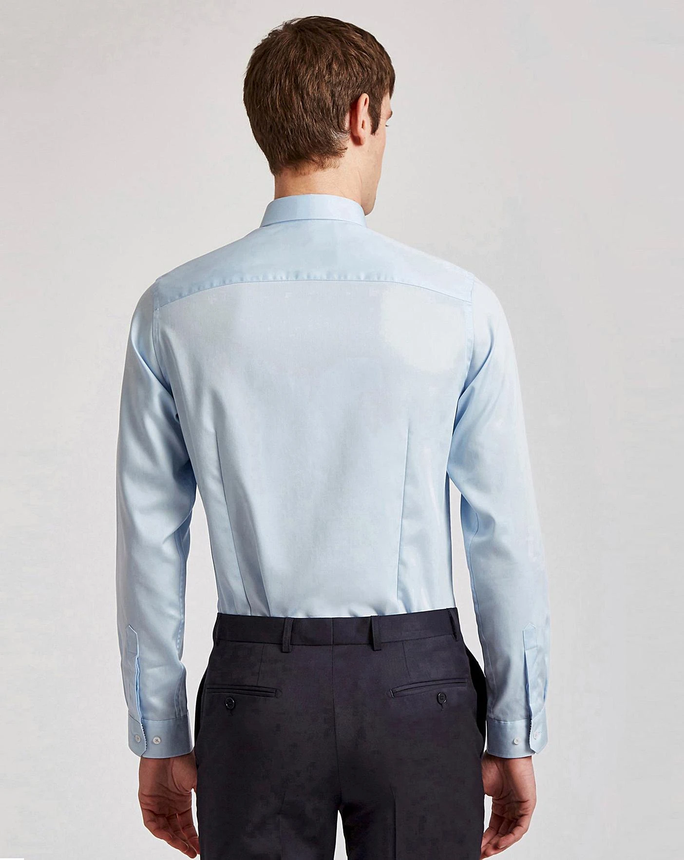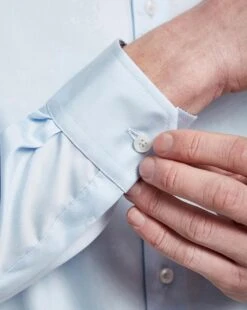 Easy, breezy, blue sateen. This piece is here to keep you soft and sweet. This 100% cotton shirt comes in a slim fit, to flatter and impress. This breathable fabric has been made in a blue sateen to give your formalwear an extra luxurious feel and tone. Suave and soft.