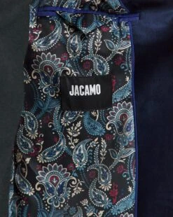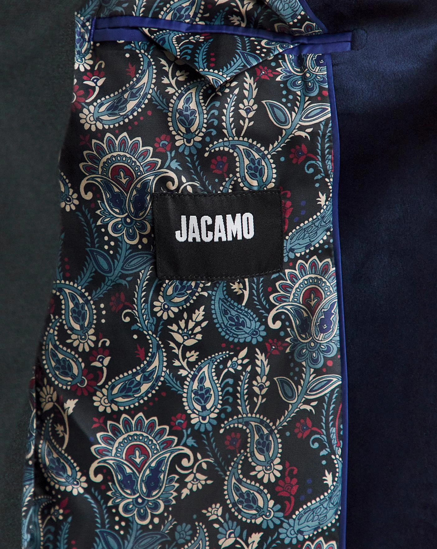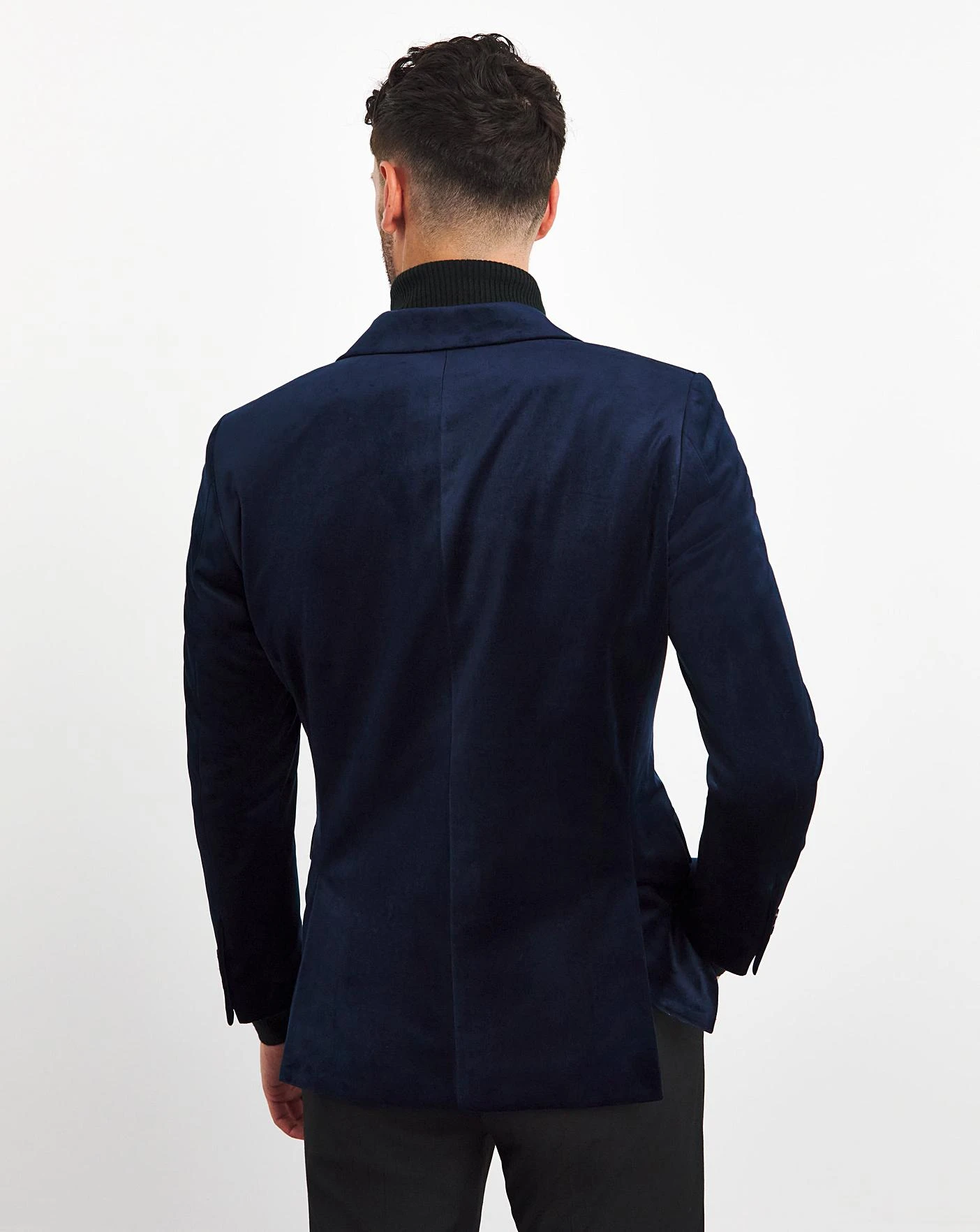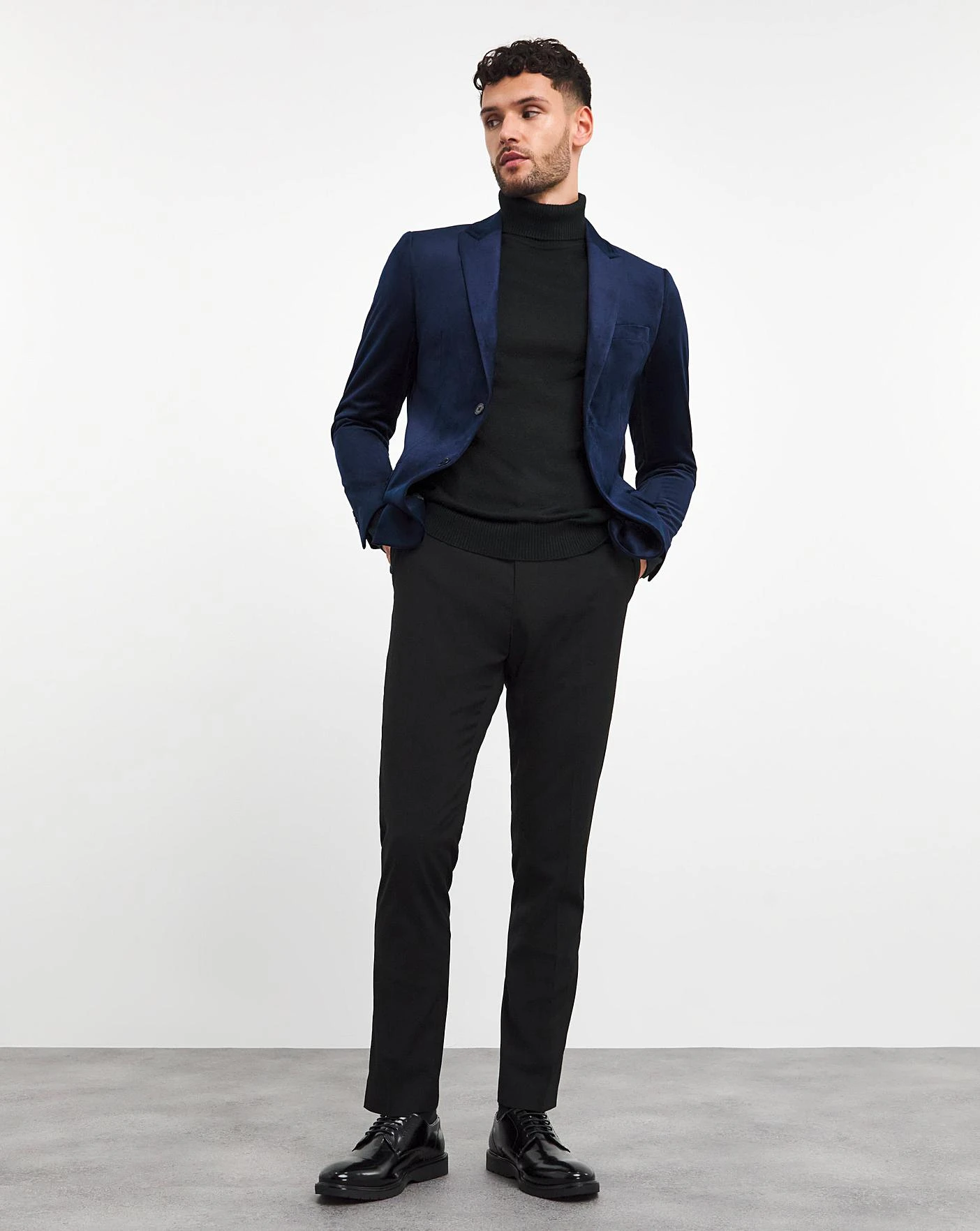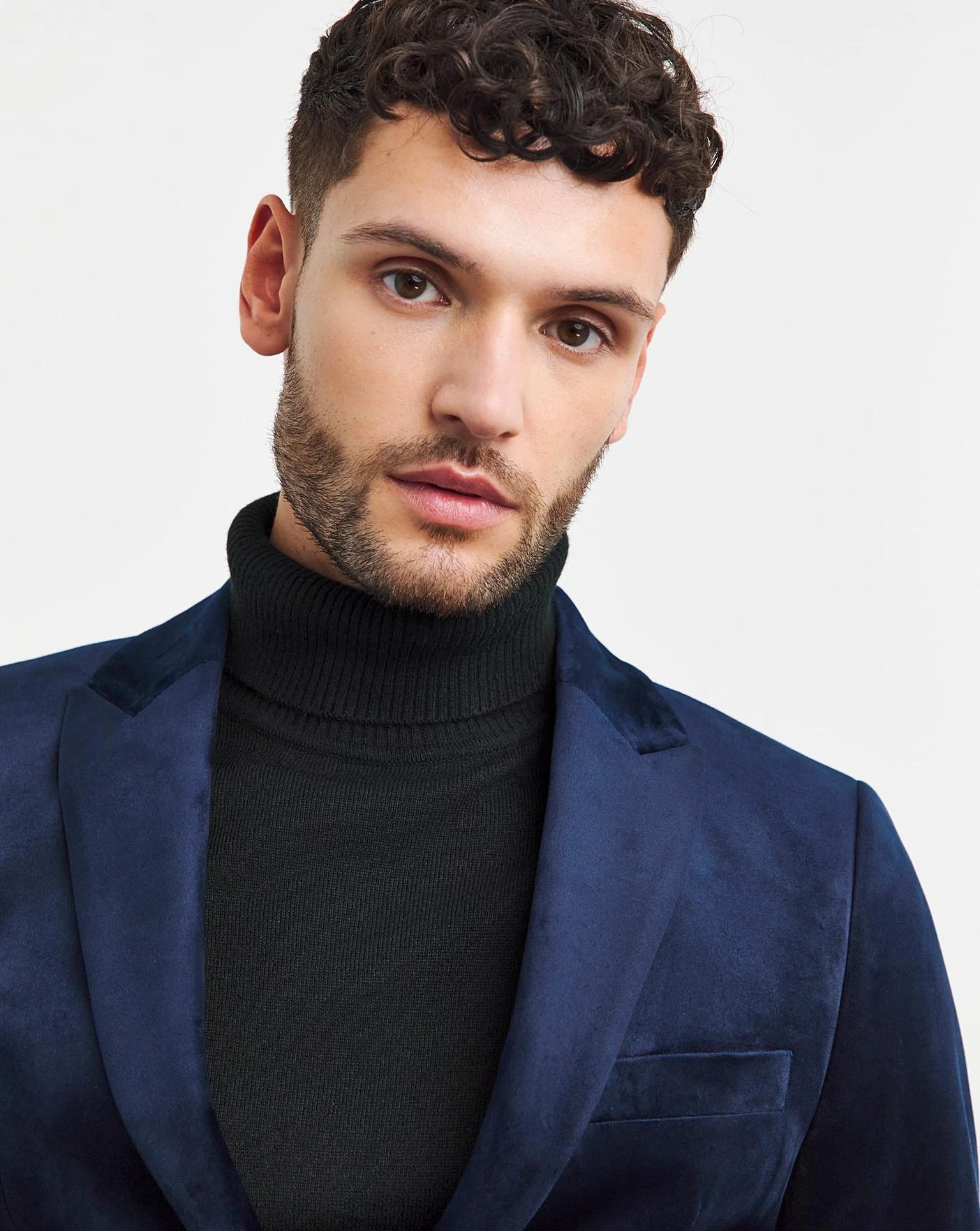 This Velvet satin blazer in Navy comes with lapel detaining and a front button fastening. Model is 6’1 and wears a size 40R.